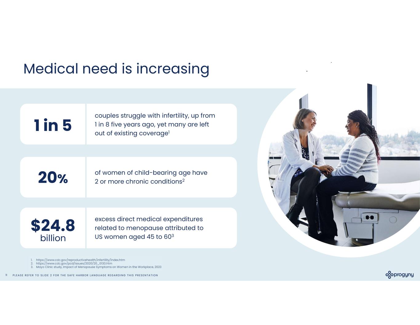 P L E A S E R E F E R T O S L I D E 2 F O R T H E S A F E H A R B O R L A N G U A G E R E G A R D I N G T H I S P R E S E N T A T I O N11 couples struggle with infertility, up from 1 in 8 five years ago, yet many are left out of existing coverage1 Medical need is increasing 1 in 5 of women of child-bearing age have 2 or more chronic conditions220% excess direct medical expenditures related to menopause attributed to US women aged 45 to 603 $24.8 billion