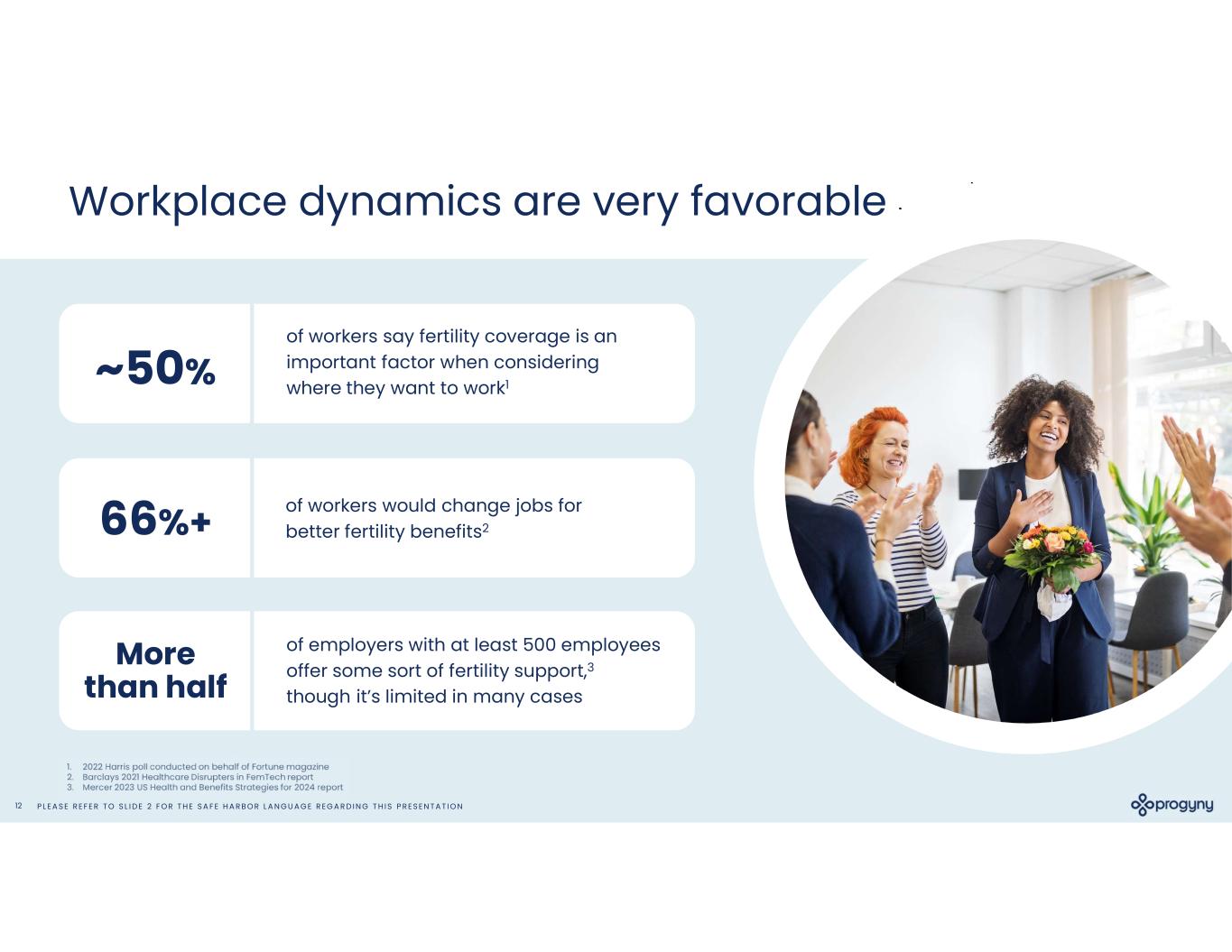 P L E A S E R E F E R T O S L I D E 2 F O R T H E S A F E H A R B O R L A N G U A G E R E G A R D I N G T H I S P R E S E N T A T I O N12 of workers say fertility coverage is an important factor when considering where they want to work1 Workplace dynamics are very favorable ~50% of workers would change jobs for better fertility benefits266%+ of employers with at least 500 employees offer some sort of fertility support,3 though it’s limited in many cases More than half