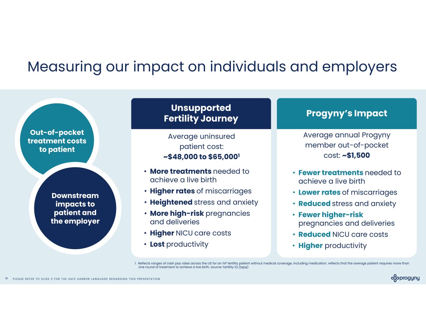 P L E A S E R E F E R T O S L I D E 2 F O R T H E S A F E H A R B O R L A N G U A G E R E G A R D I N G T H I S P R E S E N T A T I O N18 Delivering the right solution at the right time for each member Concierge support 1:1 and matched to members for their entire journey, paired with robust digital experience Specialized and managed network of the nation’s top fertility and women's health specialists Equitable benefit design that enables coverage and access to evidence-based care and Rx, personal to each member Delivering superior outcomes is in our DNA Data-driven care enabling proactive member outreach, client-level reporting with unique visibility on member outcomes