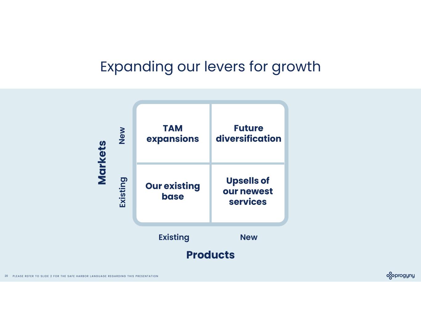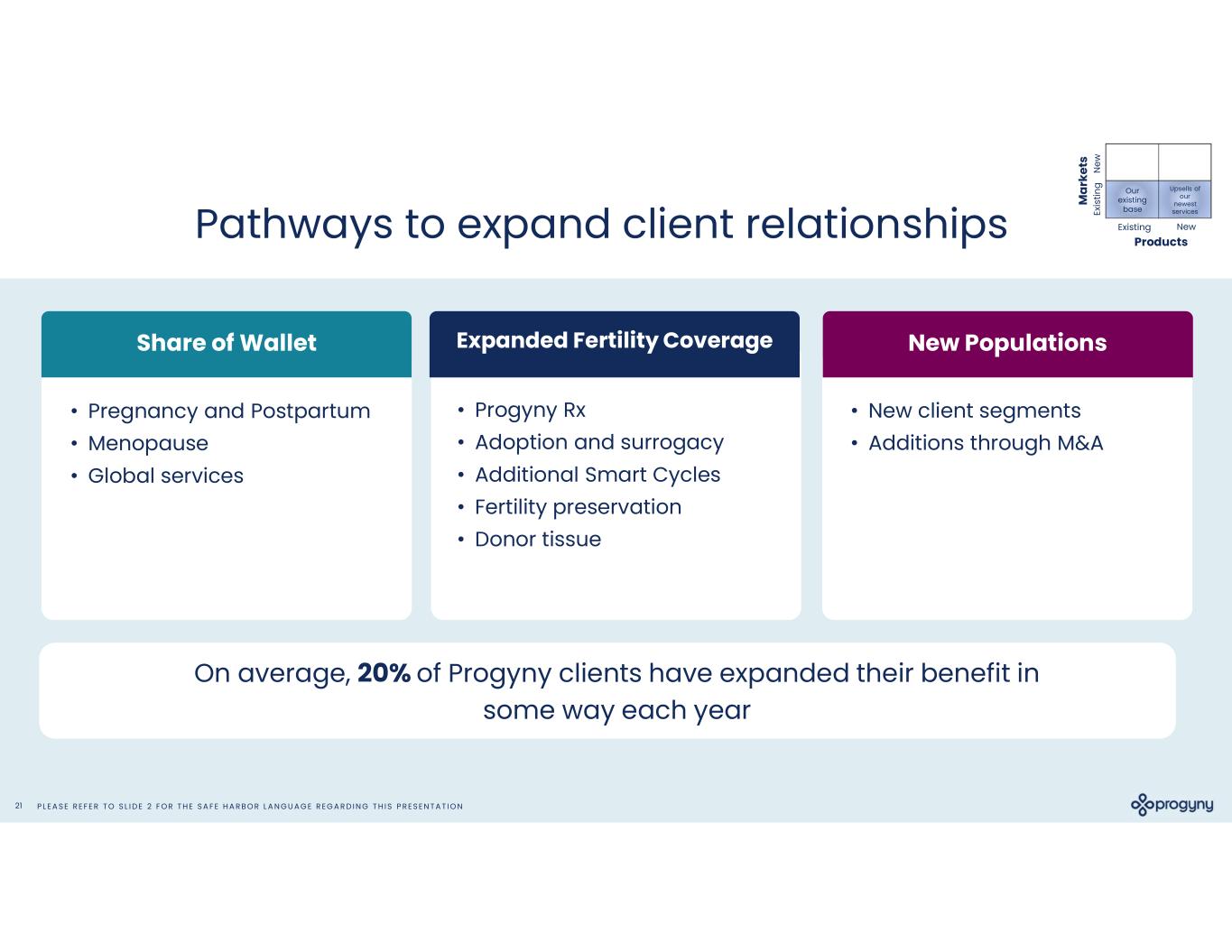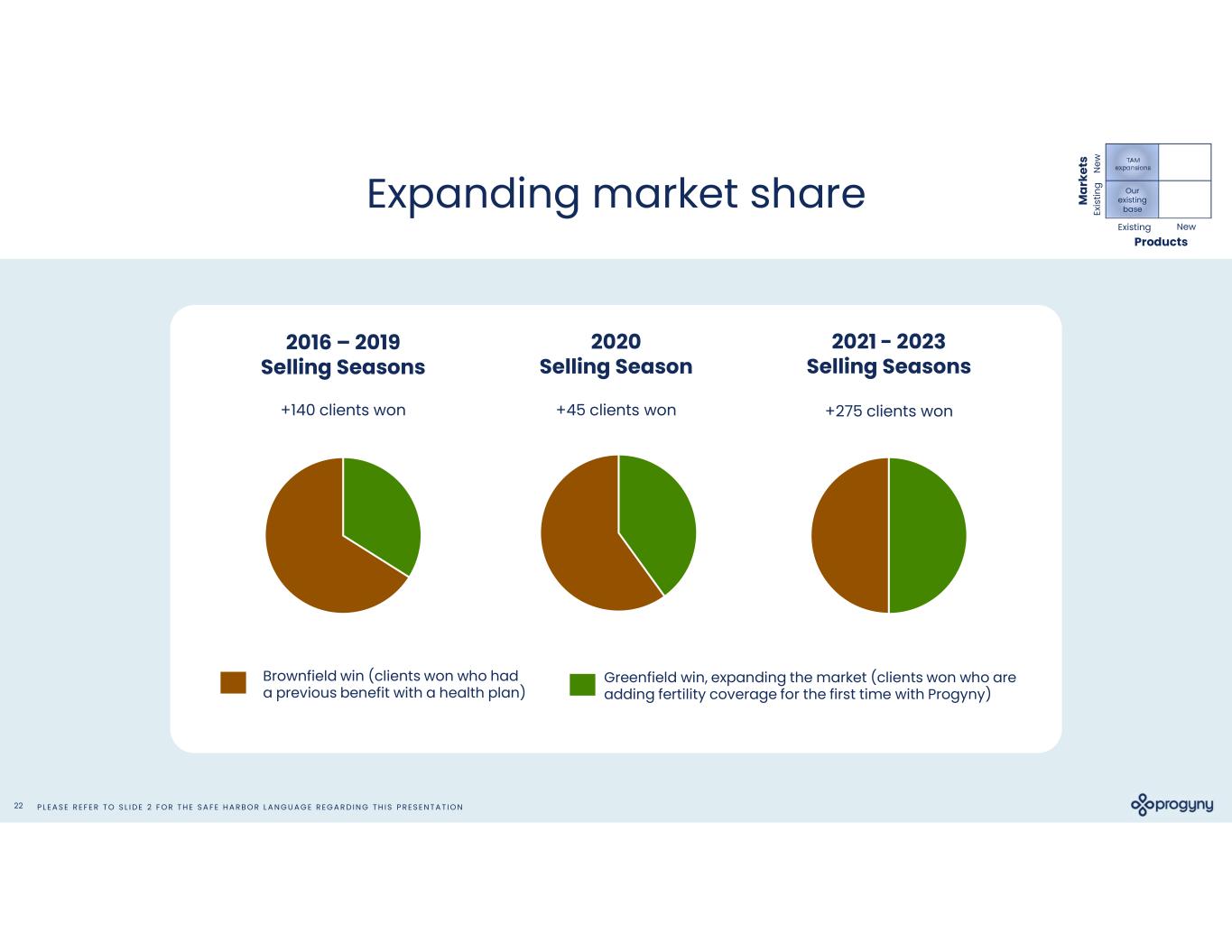 P L E A S E R E F E R T O S L I D E 2 F O R T H E S A F E H A R B O R L A N G U A G E R E G A R D I N G T H I S P R E S E N T A T I O N21 Pathways to expand client relationships NewExisting N ew Ex is tin g Products M ar ke ts Our existing base Upsells of our newest services • Progyny Rx • Adoption and surrogacy • Additional Smart Cycles • Fertility preservation • Donor tissue Expanded Fertility Coverage On average, 20% of Progyny clients have expanded their benefit in some way each year • Pregnancy and Postpartum • Menopause • Global services • New client segments • Additions through M&A Share of Wallet New Populations