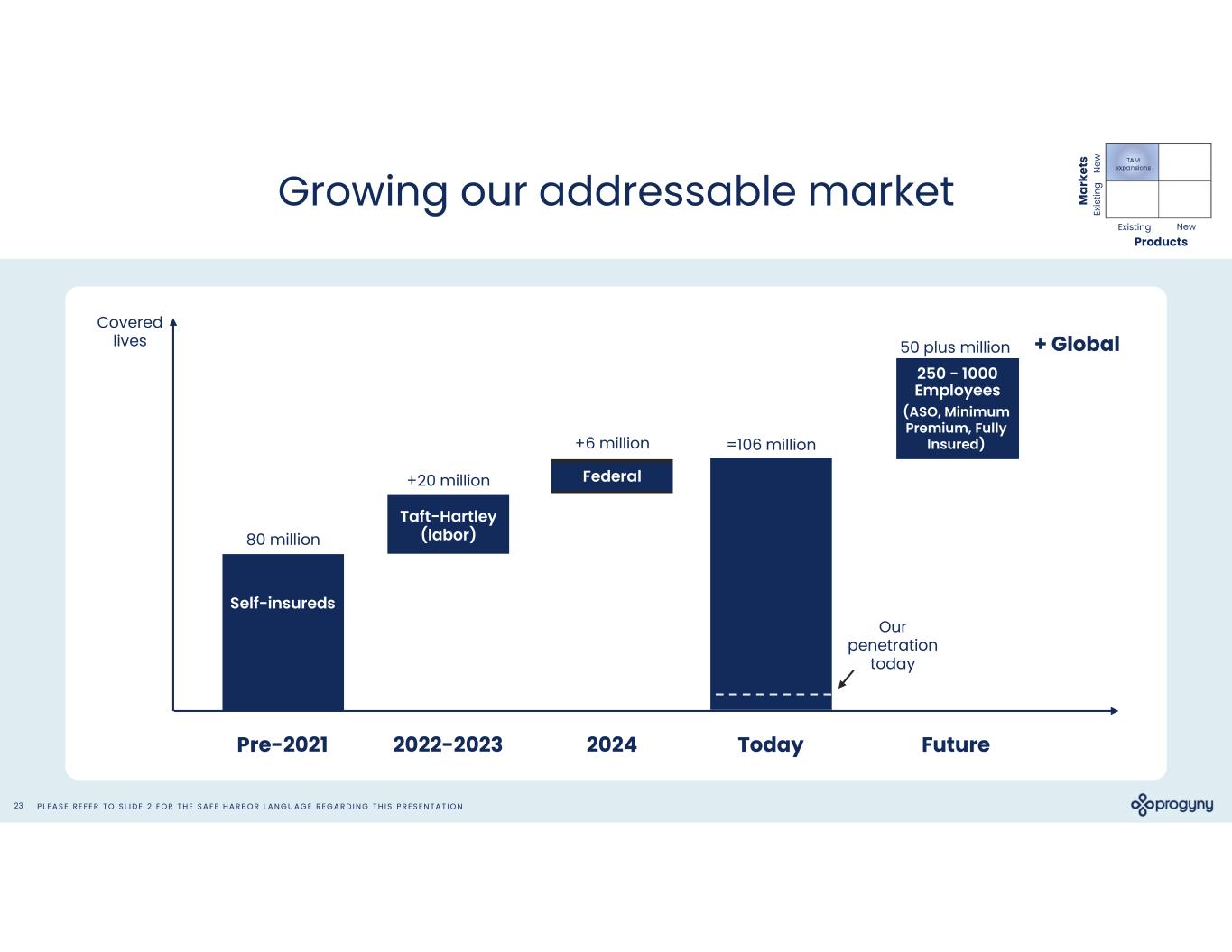 P L E A S E R E F E R T O S L I D E 2 F O R T H E S A F E H A R B O R L A N G U A G E R E G A R D I N G T H I S P R E S E N T A T I O N22 I I I I Gr Expanding market share Greenfield win, expanding the market (clients won who are adding fertility coverage for the first time with Progyny) Brownfield win (clients won who had a previous benefit with a health plan) 2021 - 2023 Selling Seasons +275 clients won 2020 Selling Season +45 clients won 2016 – 2019 Selling Seasons +140 clients won TAM expansions NewExisting Products M ar ke ts Our existing base N ew Ex is tin g