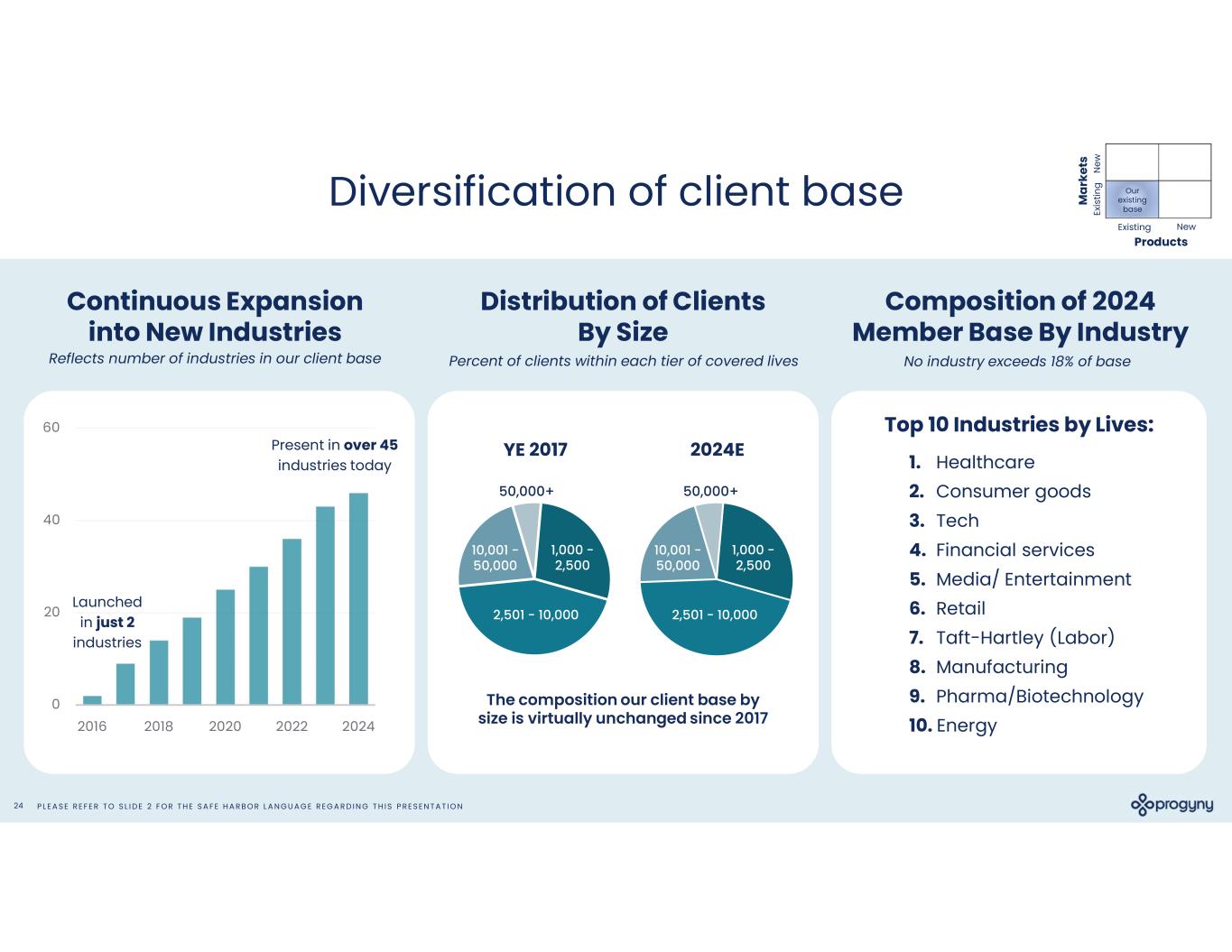 P L E A S E R E F E R T O S L I D E 2 F O R T H E S A F E H A R B O R L A N G U A G E R E G A R D I N G T H I S P R E S E N T A T I O N24 Diversification of client base Composition of 2024 Member Base By Industry Continuous Expansion into New Industries Reflects number of industries in our client base 0 20 40 60 2016 2018 2020 2022 2024 Launched in just 2 industries Present in over 45 industries today 1,000 - 2,500 2,501 - 10,000 10,001 - 50,000 50,000+ YE 2017 2024E 1,000 - 2,500 2,501 - 10,000 10,001 - 50,000 50,000+ Distribution of Clients By Size 1. Healthcare 2. Consumer goods 3. Tech 4. Financial services 5. Media/ Entertainment 6. Retail 7. Taft-Hartley (Labor) 8. Manufacturing 9. Pharma/Biotechnology 10. Energy The composition our client base by size is virtually unchanged since 2017 Percent of clients within each tier of covered lives NewExisting Products M ar ke ts Our existing base N ew Ex is tin g Top 10 Industries by Lives: No industry exceeds 18% of base
