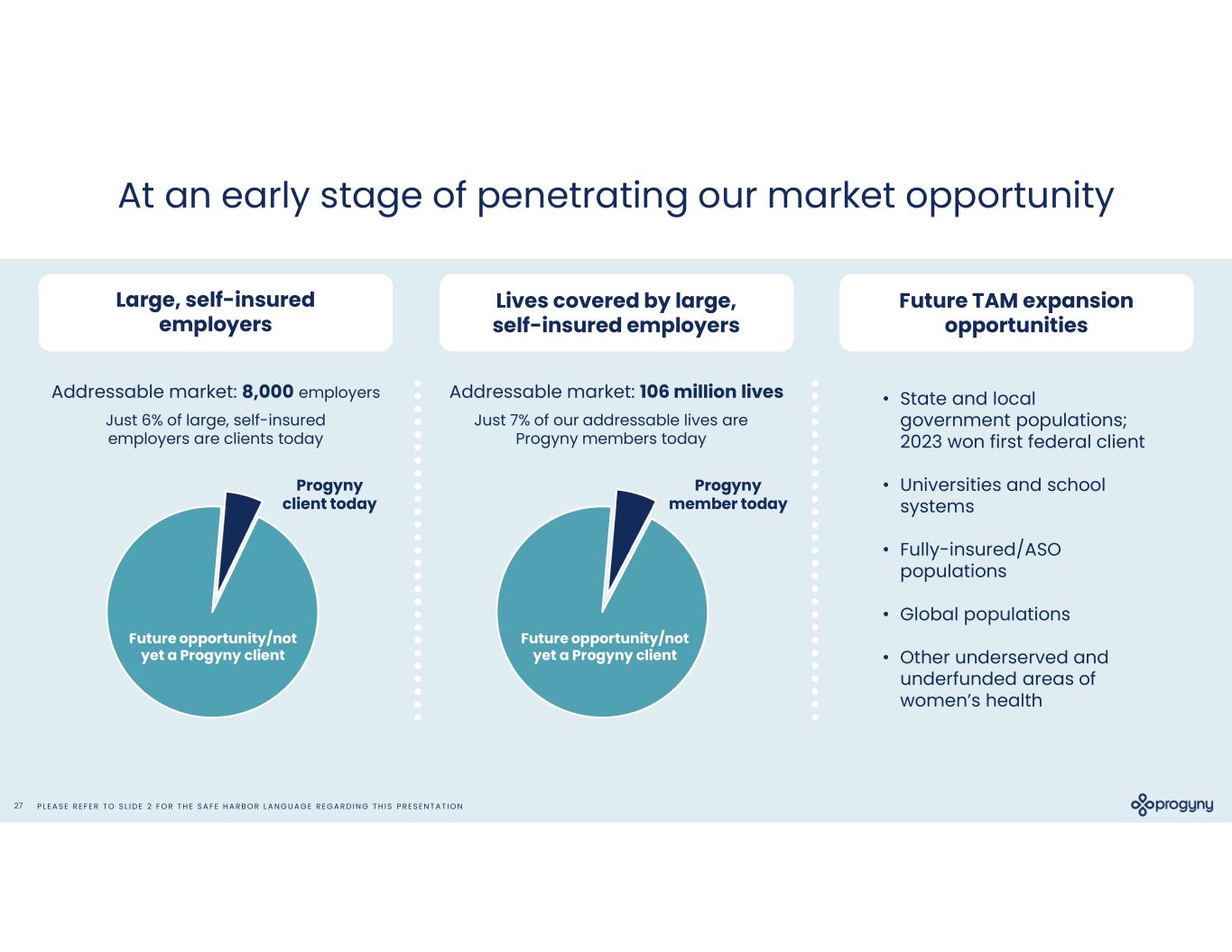 P L E A S E R E F E R T O S L I D E 2 F O R T H E S A F E H A R B O R L A N G U A G E R E G A R D I N G T H I S P R E S E N T A T I O N27 At an early stage of penetrating our market opportunity Lives covered by large, self-insured employers Large, self-insured employers Future TAM expansion opportunities Addressable market: 8,000 employers Just 6% of large, self-insured employers are clients today Progyny client today Future opportunity/not yet a Progyny client Addressable market: 106 million lives Just 7% of our addressable lives are Progyny members today Progyny member today Future opportunity/not yet a Progyny client • State and local government populations; 2023 won first federal client • Universities and school systems • Fully-insured/ASO populations • Global populations • Other underserved and underfunded areas of women’s health