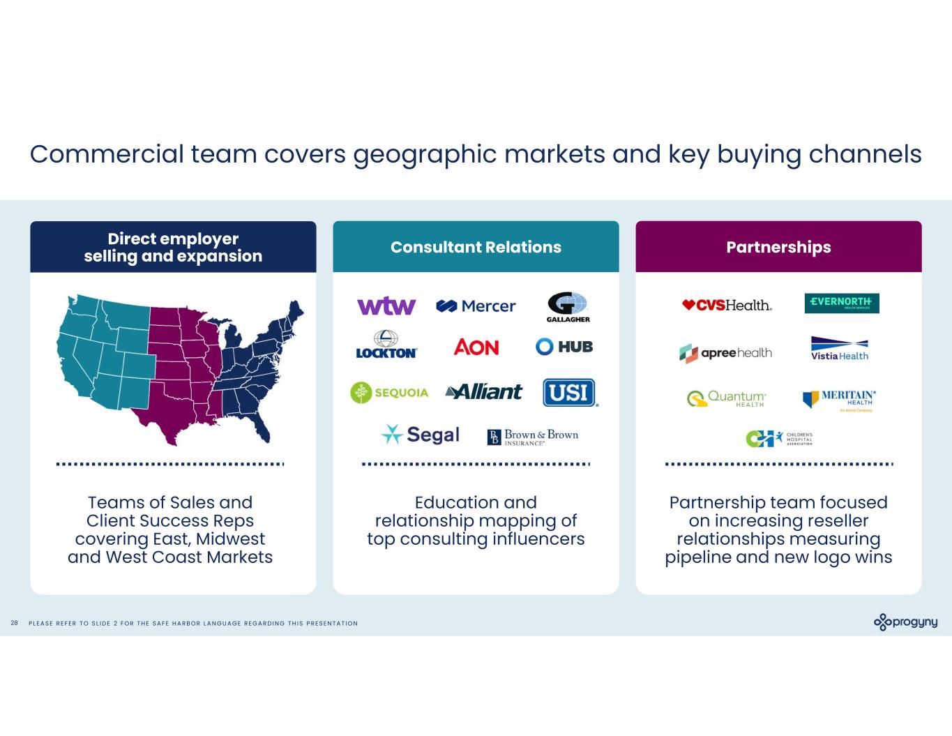 P L E A S E R E F E R T O S L I D E 2 F O R T H E S A F E H A R B O R L A N G U A G E R E G A R D I N G T H I S P R E S E N T A T I O N28 Commercial team covers geographic markets and key buying channels Direct employer selling and expansion Consultant Relations Partnerships Teams of Sales and Client Success Reps covering East, Midwest and West Coast Markets Education and relationship mapping of top consulting influencers Partnership team focused on increasing reseller relationships measuring pipeline and new logo wins