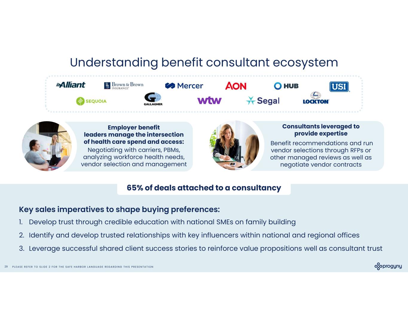 P L E A S E R E F E R T O S L I D E 2 F O R T H E S A F E H A R B O R L A N G U A G E R E G A R D I N G T H I S P R E S E N T A T I O N29 Understanding benefit consultant ecosystem Negotiating with carriers, PBMs, analyzing workforce health needs, vendor selection and management Consultants leveraged to provide expertise Benefit recommendations and run vendor selections through RFPs or other managed reviews as well as negotiate vendor contracts 65% of deals attached to a consultancy Key sales imperatives to shape buying preferences: 1. Develop trust through credible education with national SMEs on family building 2. Identify and develop trusted relationships with key influencers within national and regional offices 3. Leverage successful shared client success stories to reinforce value propositions well as consultant trust Employer benefit leaders manage the intersection of health care spend and access: