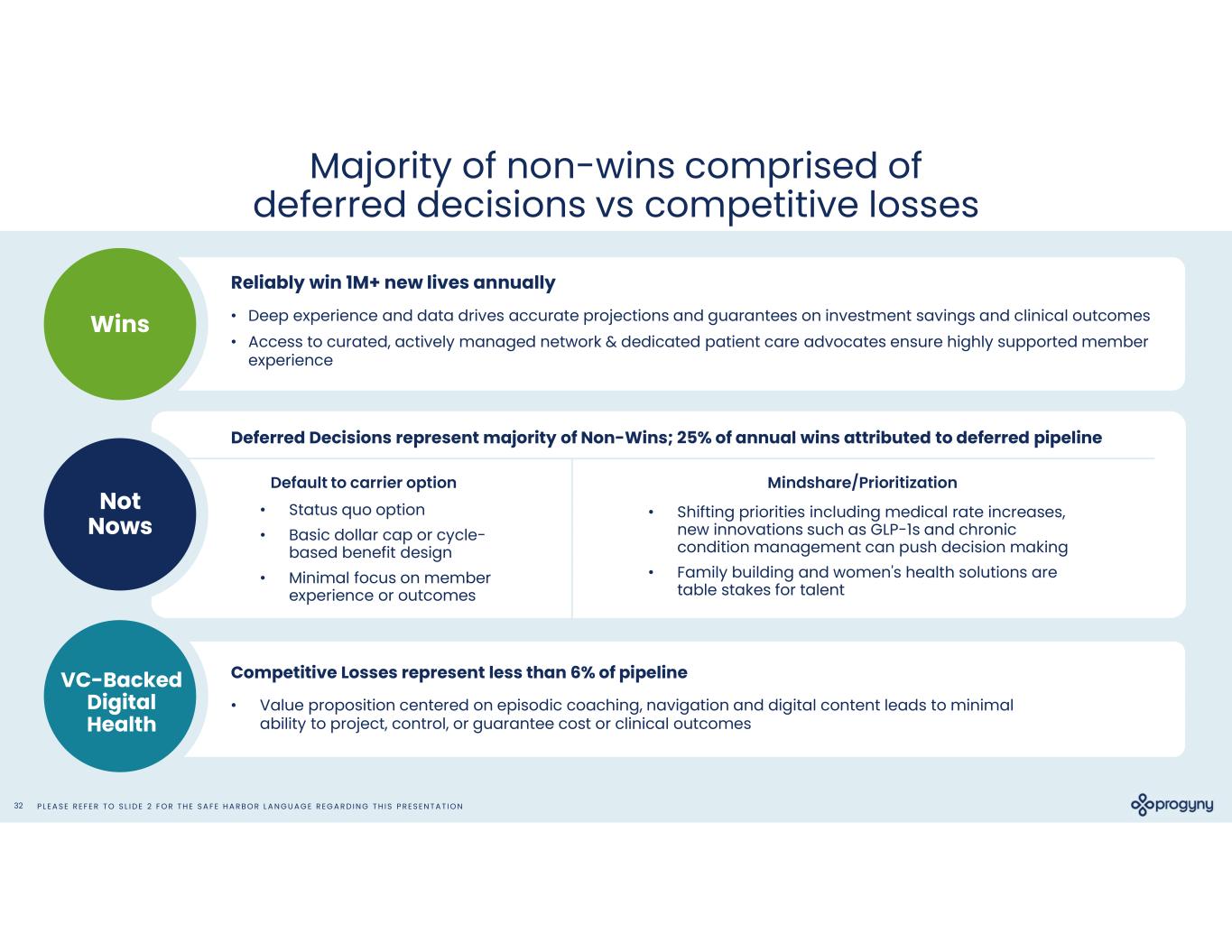 P L E A S E R E F E R T O S L I D E 2 F O R T H E S A F E H A R B O R L A N G U A G E R E G A R D I N G T H I S P R E S E N T A T I O N32 Majority of non-wins comprised of deferred decisions vs competitive losses Wins Not Nows • Deep experience and data drives accurate projections and guarantees on investment savings and clinical outcomes • Access to curated, actively managed network & dedicated patient care advocates ensure highly supported member experience • Status quo option • Basic dollar cap or cycle- based benefit design • Minimal focus on member experience or outcomes • Shifting priorities including medical rate increases, new innovations such as GLP-1s and chronic condition management can push decision making • Family building and women's health solutions are table stakes for talent VC-Backed Digital Health • Value proposition centered on episodic coaching, navigation and digital content leads to minimal ability to project, control, or guarantee cost or clinical outcomes Deferred Decisions represent majority of Non-Wins; 25% of annual wins attributed to deferred pipeline Reliably win 1M+ new lives annually Default to carrier option Mindshare/Prioritization Competitive Losses represent less than 6% of pipeline
