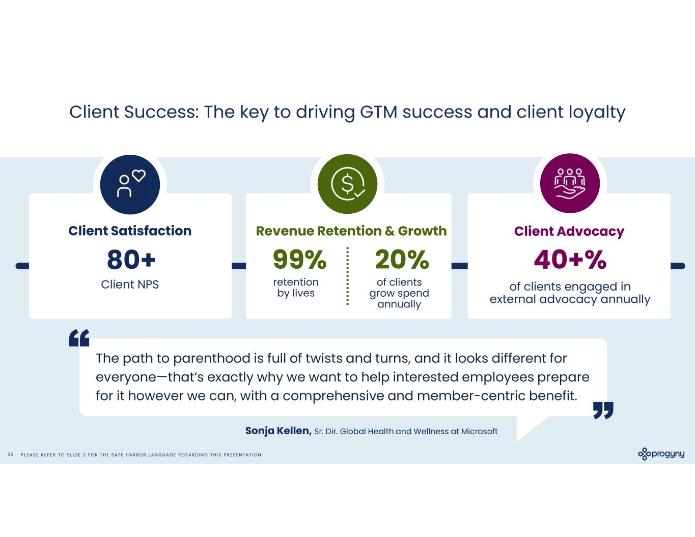 P L E A S E R E F E R T O S L I D E 2 F O R T H E S A F E H A R B O R L A N G U A G E R E G A R D I N G T H I S P R E S E N T A T I O N35 Client Success: The key to driving GTM success and client loyalty Revenue Retention & GrowthClient Satisfaction Client Advocacy 80+ of clients grow spend annually of clients engaged in external advocacy annually The path to parenthood is full of twists and turns, and it looks different for everyone—that’s exactly why we want to help interested employees prepare for it however we can, with a comprehensive and member-centric benefit. ” “ Sonja Kellen, Sr. Dir. Global Health and Wellness at Microsoft Client NPS 99% retention by lives 20% 40+%