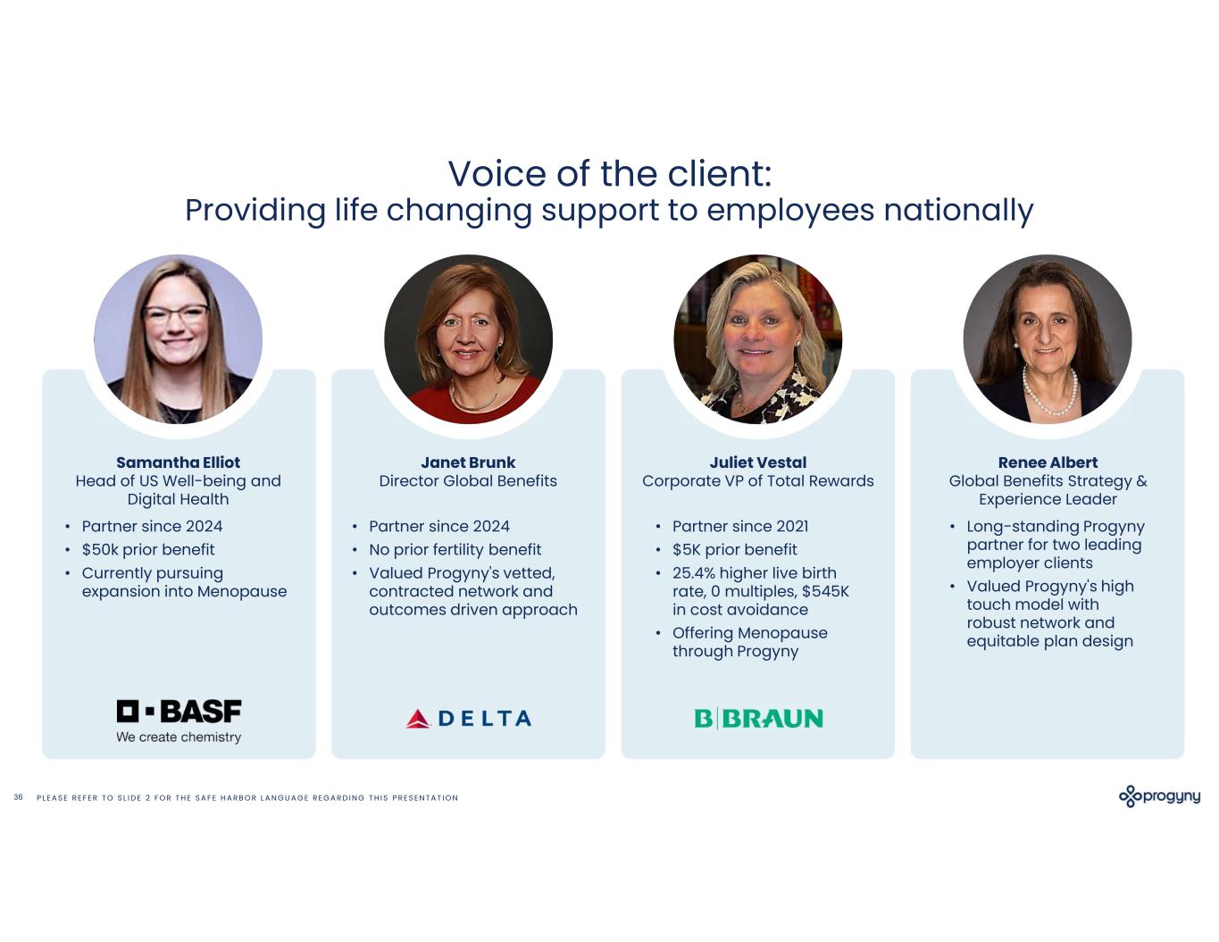 P L E A S E R E F E R T O S L I D E 2 F O R T H E S A F E H A R B O R L A N G U A G E R E G A R D I N G T H I S P R E S E N T A T I O N36 Samantha Elliot Head of US Well-being and Digital Health • Partner since 2024 • $50k prior benefit • Currently pursuing expansion into Menopause Janet Brunk Director Global Benefits Juliet Vestal Corporate VP of Total Rewards Renee Albert Global Benefits Strategy & Experience Leader • Partner since 2024 • No prior fertility benefit • Valued Progyny's vetted, contracted network and outcomes driven approach • Partner since 2021 • $5K prior benefit • 25.4% higher live birth rate, 0 multiples, $545K in cost avoidance • Offering Menopause through Progyny • Long-standing Progyny partner for two leading employer clients • Valued Progyny's high touch model with robust network and equitable plan design Voice of the client: Providing life changing support to employees nationally