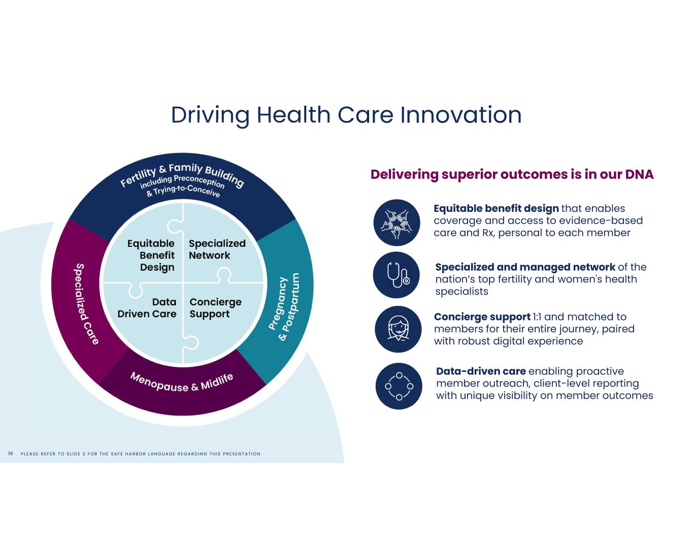 P L E A S E R E F E R T O S L I D E 2 F O R T H E S A F E H A R B O R L A N G U A G E R E G A R D I N G T H I S P R E S E N T A T I O N38 Driving Health Care Innovation Concierge support 1:1 and matched to members for their entire journey, paired with robust digital experience Specialized and managed network of the nation’s top fertility and women's health specialists Equitable benefit design that enables coverage and access to evidence-based care and Rx, personal to each member Delivering superior outcomes is in our DNA Data-driven care enabling proactive member outreach, client-level reporting with unique visibility on member outcomes