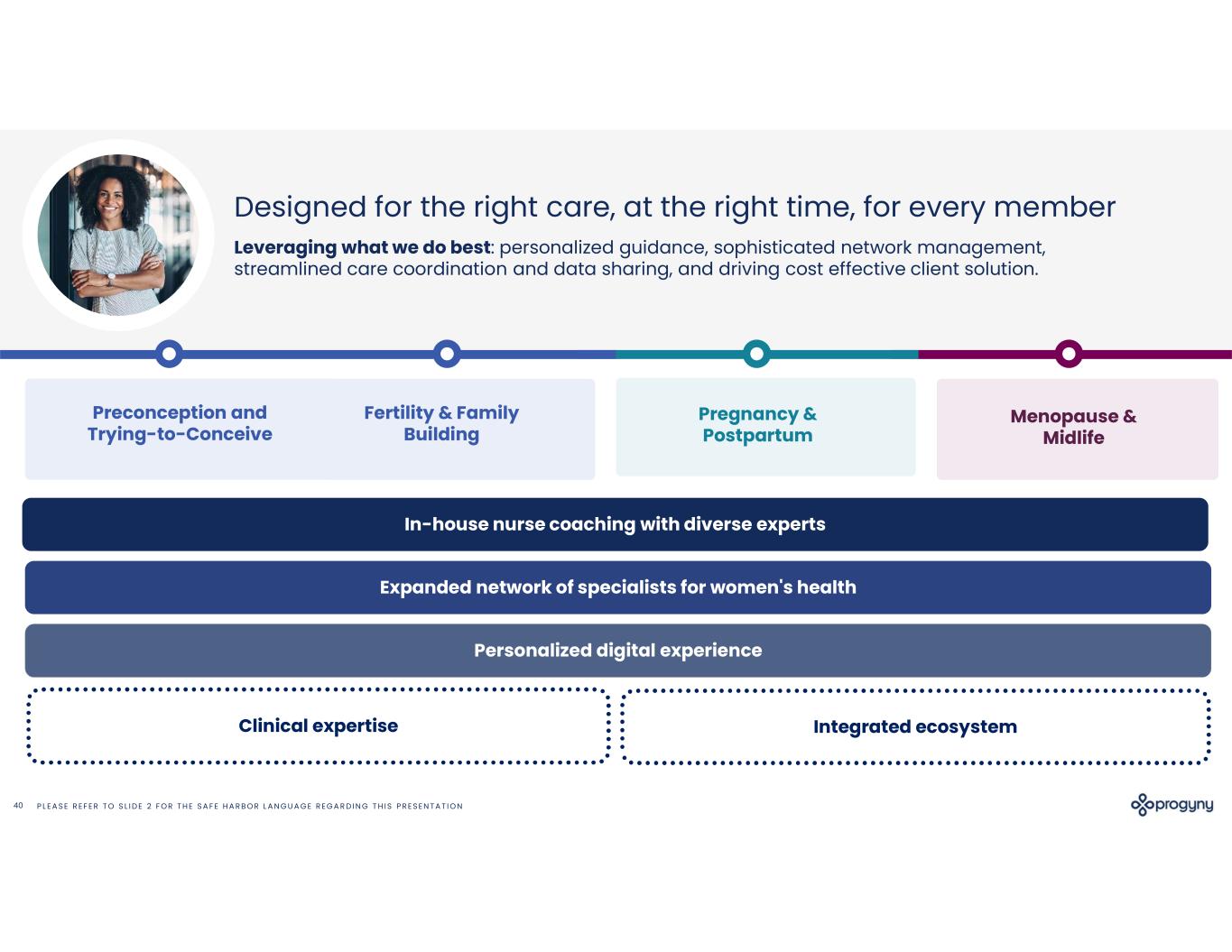 P L E A S E R E F E R T O S L I D E 2 F O R T H E S A F E H A R B O R L A N G U A G E R E G A R D I N G T H I S P R E S E N T A T I O N40 Designed for the right care, at the right time, for every member Pregnancy & Postpartum Menopause & Midlife Fertility & Family Building Leveraging what we do best: personalized guidance, sophisticated network management, streamlined care coordination and data sharing, and driving cost effective client solution. Preconception and Trying-to-Conceive In-house nurse coaching with diverse experts Expanded network of specialists for women's health Integrated ecosystemClinical expertise Personalized digital experience