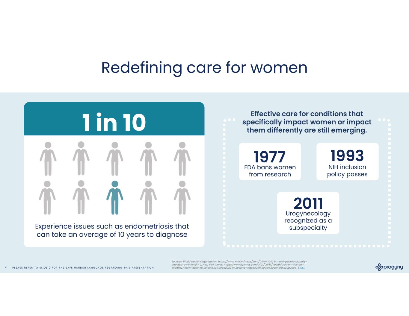 P L E A S E R E F E R T O S L I D E 2 F O R T H E S A F E H A R B O R L A N G U A G E R E G A R D I N G T H I S P R E S E N T A T I O N41 1 in 10 Experience issues such as endometriosis that can take an average of 10 years to diagnose 1993 NIH inclusion policy passes 1977 FDA bans women from research Sources: World Health Organization; https://www.who.int/news/item/04-04-2023-1-in-6-people-globally- affected-by-infertility 2. New York Times: https://www.nytimes.com/2021/09/13/health/women-doctors- infertility.html#:~:text=In%20fact%2C%20a%202016%20survey,rate%20of%20the%20general%20public. 3. NSI, Redefining care for women 2011 Urogynecology recognized as a subspecialty Effective care for conditions that specifically impact women or impact them differently are still emerging.