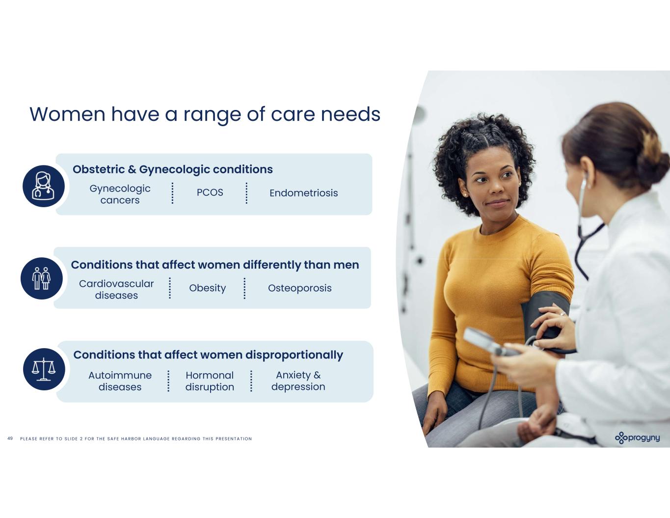 P L E A S E R E F E R T O S L I D E 2 F O R T H E S A F E H A R B O R L A N G U A G E R E G A R D I N G T H I S P R E S E N T A T I O N49 Women have a range of care needs Obstetric & Gynecologic conditions PCOS Conditions that affect women differently than men Cardiovascular diseases OsteoporosisObesity Conditions that affect women disproportionally Anxiety & depression Hormonal disruption Autoimmune diseases Gynecologic cancers Endometriosis