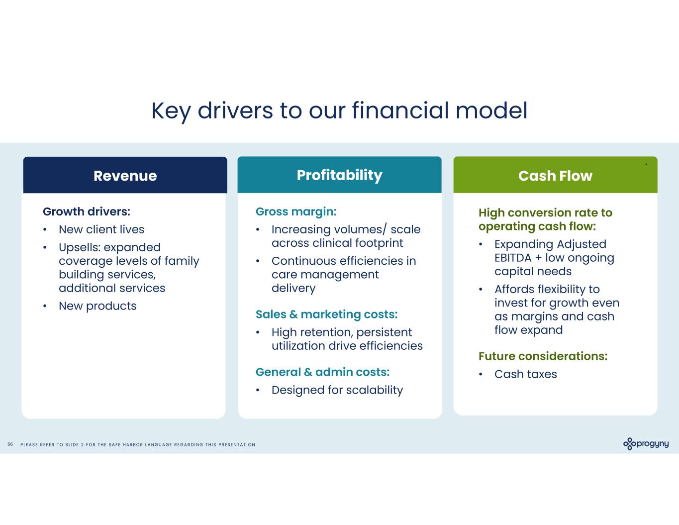 P L E A S E R E F E R T O S L I D E 2 F O R T H E S A F E H A R B O R L A N G U A G E R E G A R D I N G T H I S P R E S E N T A T I O N56 Key drivers to our financial model Revenue Profitability High conversion rate to operating cash flow: • Expanding Adjusted EBITDA + low ongoing capital needs • Affords flexibility to invest for growth even as margins and cash flow expand Future considerations: • Cash taxes Cash Flow Gross margin: • Increasing volumes/ scale across clinical footprint • Continuous efficiencies in care management delivery Sales & marketing costs: • High retention, persistent utilization drive efficiencies General & admin costs: • Designed for scalability Growth drivers: • New client lives • Upsells: expanded coverage levels of family building services, additional services • New products