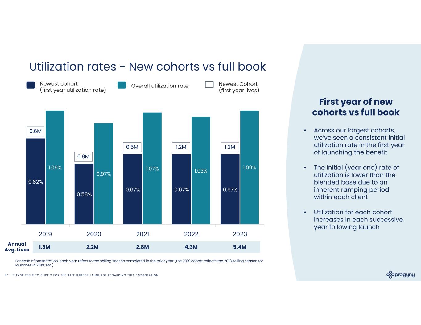 P L E A S E R E F E R T O S L I D E 2 F O R T H E S A F E H A R B O R L A N G U A G E R E G A R D I N G T H I S P R E S E N T A T I O N57 First year of new cohorts vs full book • Across our largest cohorts, we’ve seen a consistent initial utilization rate in the first year of launching the benefit • The initial (year one) rate of utilization is lower than the blended base due to an inherent ramping period within each client • Utilization for each cohort increases in each successive year following launch For ease of presentation, each year refers to the selling season completed in the prior year (the 2019 cohort reflects the 2018 selling season for launches in 2019, etc.) 0.82% 0.58% 0.67% 0.67% 0.67% 1.09% 0.97% 1.07% 1.03% 1.09% 2019 2020 2021 2022 2023 1.3M 2.2M 2.8M 4.3M 5.4MAnnual Avg. Lives 0.6M 0.8M 0.5M 1.2M 1.2M Newest cohort (first year utilization rate) Newest Cohort (first year lives) Overall utilization rate Utilization rates - New cohorts vs full book