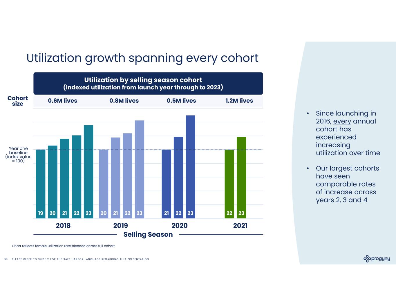 P L E A S E R E F E R T O S L I D E 2 F O R T H E S A F E H A R B O R L A N G U A G E R E G A R D I N G T H I S P R E S E N T A T I O N58 19 20 21 2220 21 22 2321 22 2322 2323 Utilization growth spanning every cohort Chart reflects female utilization rate blended across full cohort. Year one baseline (index value = 100) Cohort size 1.2M lives0.5M lives0.8M lives0.6M lives Utilization by selling season cohort (indexed utilization from launch year through to 2023) • Since launching in 2016, every annual cohort has experienced increasing utilization over time • Our largest cohorts have seen comparable rates of increase across years 2, 3 and 4 Selling Season 2021202020192018
