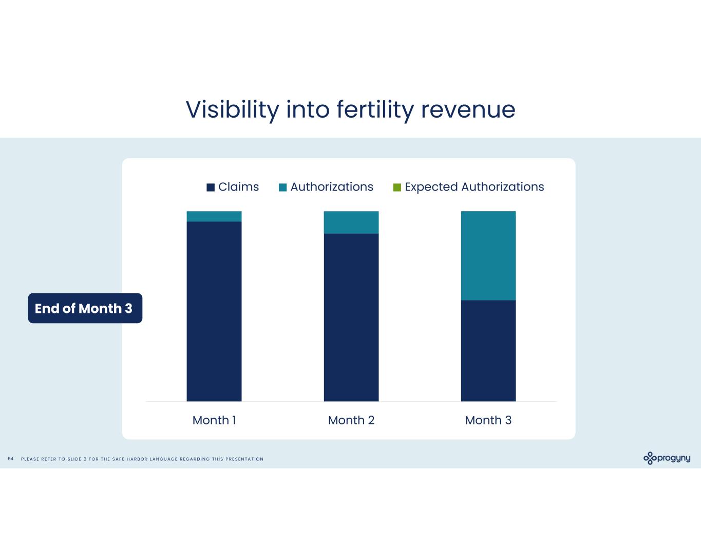 P L E A S E R E F E R T O S L I D E 2 F O R T H E S A F E H A R B O R L A N G U A G E R E G A R D I N G T H I S P R E S E N T A T I O N63 Visibility into fertility revenue Month 1 Month 2 Month 3 Claims Authorizations Expected Authorizations End of Month 2