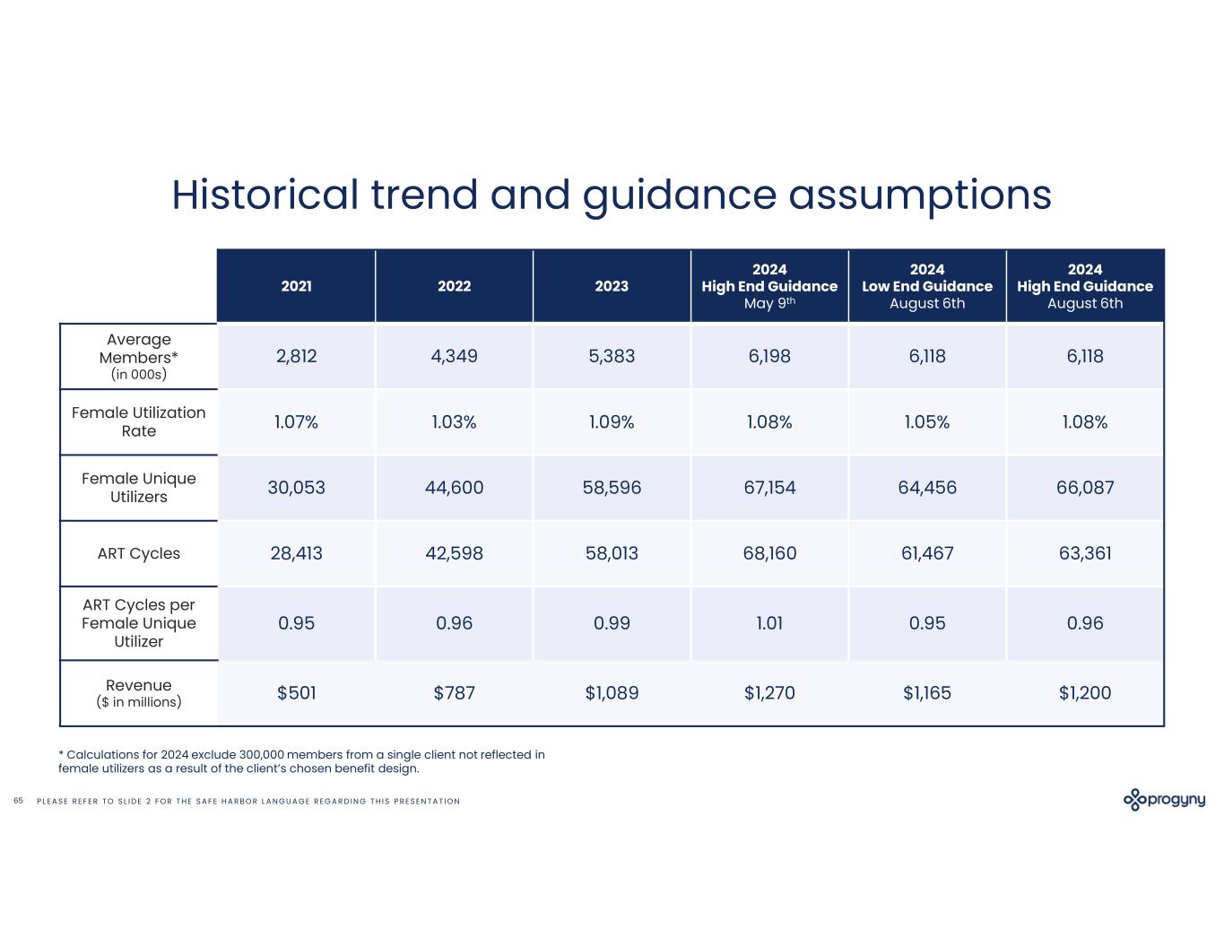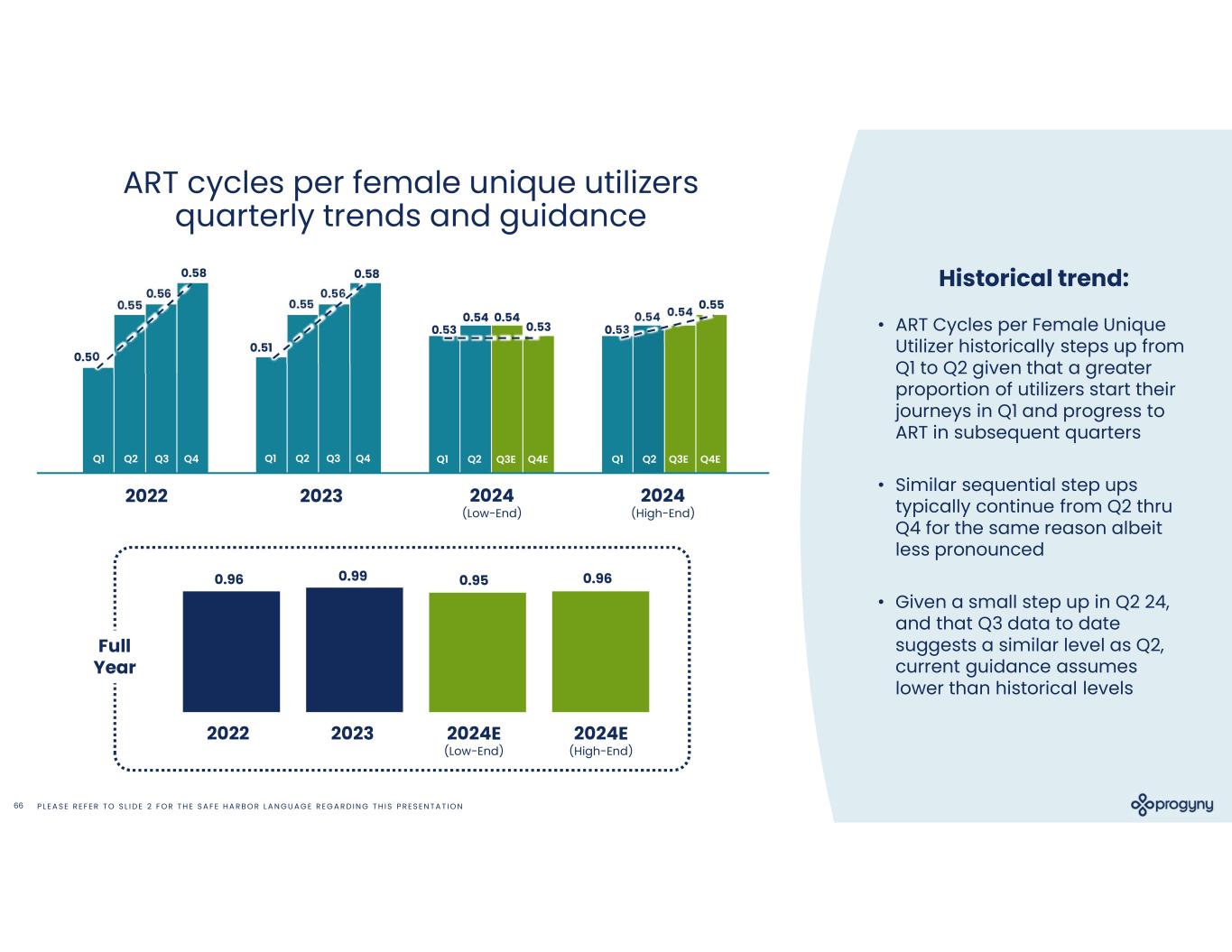 P L E A S E R E F E R T O S L I D E 2 F O R T H E S A F E H A R B O R L A N G U A G E R E G A R D I N G T H I S P R E S E N T A T I O N65 Historical trend and guidance assumptions 2024 High End Guidance August 6th 2024 Low End Guidance August 6th 2024 High End Guidance May 9th 202320222021 6,1186,1186,1985,3834,3492,812 Average Members* (in 000s) 1.08%1.05%1.08%1.09%1.03%1.07%Female Utilization Rate 66,08764,45667,15458,59644,60030,053Female Unique Utilizers 63,36161,46768,16058,01342,59828,413ART Cycles 0.960.951.010.990.960.95 ART Cycles per Female Unique Utilizer $1,200$1,165$1,270$1,089$787$501Revenue ($ in millions) * Calculations for 2024 exclude 300,000 members from a single client not reflected in female utilizers as a result of the client’s chosen benefit design.
