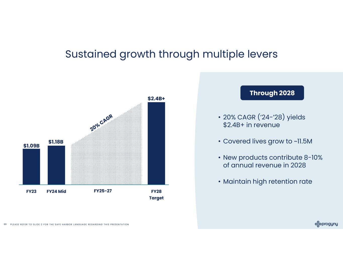 P L E A S E R E F E R T O S L I D E 2 F O R T H E S A F E H A R B O R L A N G U A G E R E G A R D I N G T H I S P R E S E N T A T I O N69 Sustained growth through multiple levers FY23 FY24 Mid FY28 Target FY25-27 $1.09B $1.18B $2.4B+ • 20% CAGR (’24-’28) yields $2.4B+ in revenue • Covered lives grow to ~11.5M • New products contribute 8-10% of annual revenue in 2028 • Maintain high retention rate Through 2028