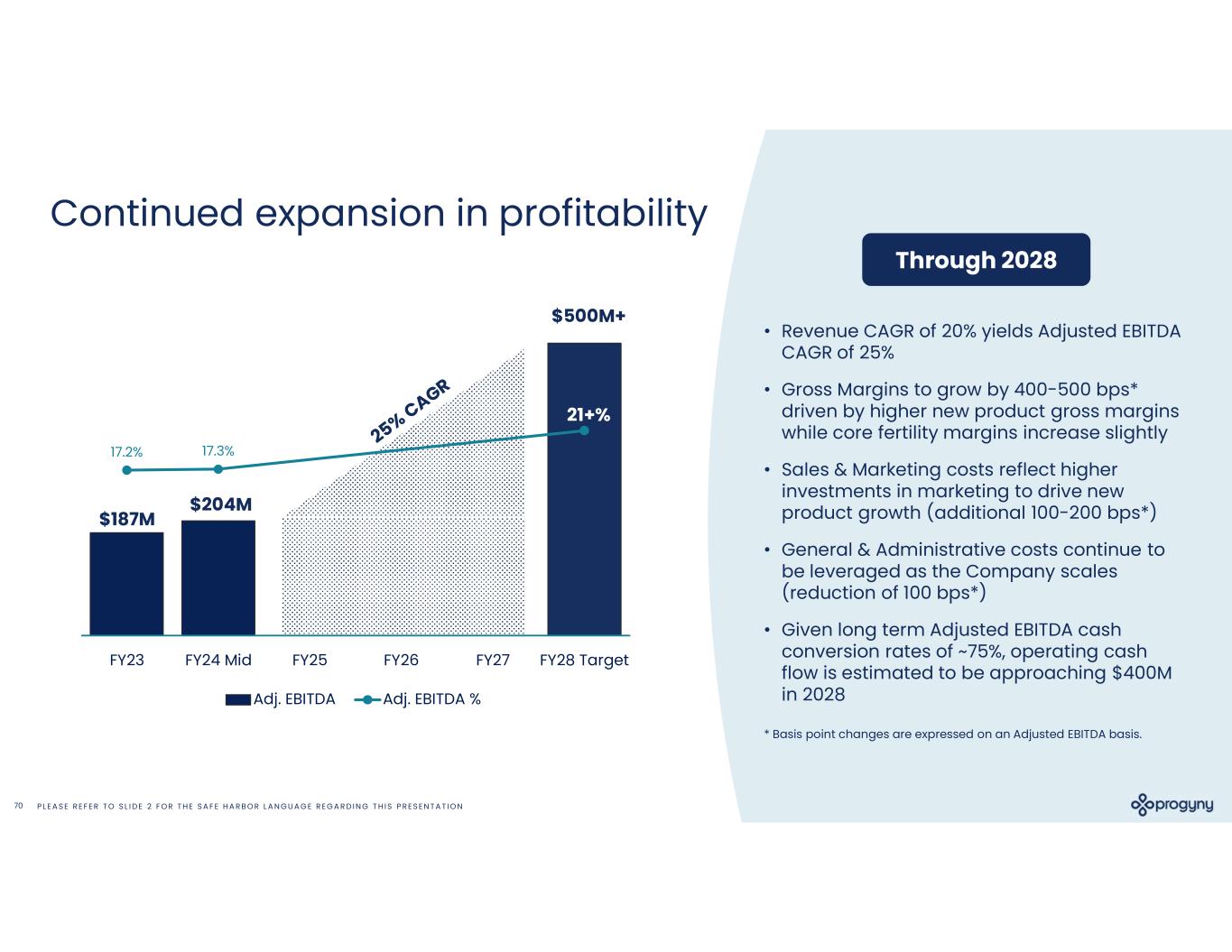 P L E A S E R E F E R T O S L I D E 2 F O R T H E S A F E H A R B O R L A N G U A G E R E G A R D I N G T H I S P R E S E N T A T I O N70 17.2% 17.3% 0.0% 5.0% 10.0% 15.0% 20.0% 25.0% 30.0% 35.0% 40.0% $- $100 $200 $300 $400 $500 $600 $700 FY23 FY24 Mid FY25 FY26 FY27 FY28 Target Adj. EBITDA Adj. EBITDA % Continued expansion in profitability $500M+ • Revenue CAGR of 20% yields Adjusted EBITDA CAGR of 25% • Gross Margins to grow by 400-500 bps* driven by higher new product gross margins while core fertility margins increase slightly • Sales & Marketing costs reflect higher investments in marketing to drive new product growth (additional 100-200 bps*) • General & Administrative costs continue to be leveraged as the Company scales (reduction of 100 bps*) • Given long term Adjusted EBITDA cash conversion rates of ~75%, operating cash flow is estimated to be approaching $400M in 2028 21+% $187M $204M Through 2028 * Basis point changes are expressed on an Adjusted EBITDA basis.