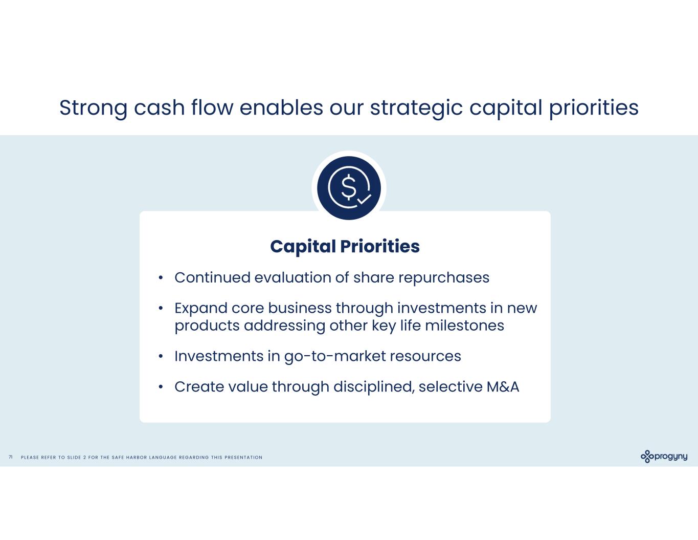 P L E A S E R E F E R T O S L I D E 2 F O R T H E S A F E H A R B O R L A N G U A G E R E G A R D I N G T H I S P R E S E N T A T I O N71 Strong cash flow enables our strategic capital priorities • Continued evaluation of share repurchases • Expand core business through investments in new products addressing other key life milestones • Investments in go-to-market resources • Create value through disciplined, selective M&A Capital Priorities