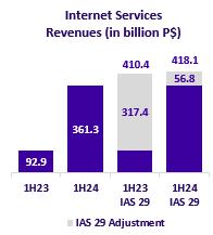 Internet services revenues totaled P$418,073 million during 1H24 (+P$7,700 million or +1.9% vs. 1H23). In 2Q24, Internet services revenues totaled P$218,247 million (+12.4% compared to 2Q23). Total broadband subscribers reached approximately 4.1 million in 1H24 (-34 thousand vs. 1H23). The monthly churn rate of Internet services was 1.9% and 1.7% as of June 30, 2024, and 2023, respectively.