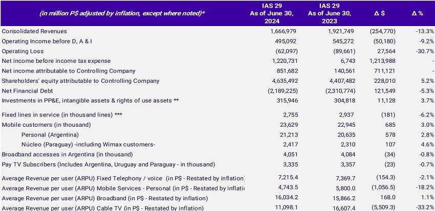 | · | The Company's Consolidated Revenues amounted to P$1,666,979 million in 1H24 (-13.3% in constant currency compared to 1H23). Service Revenues totaled P$1,572,594 million (-11.7% vs. 1H23), in a context where year-over-year inflation remains at high levels. In 2Q24, revenues reached P$856,084 million (-8.3% vs. 2Q23) while Service Revenues totaled P$799,692 million (-6.7% vs. 2Q23 and +3.5% vs. 1Q24), indicating an improvement in the trend of these revenues in real terms. |