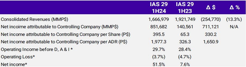 During 1H24, Consolidated Revenues amounted to P$1,666,979 million, from which Service Revenues totaled P$1,572,594 million.