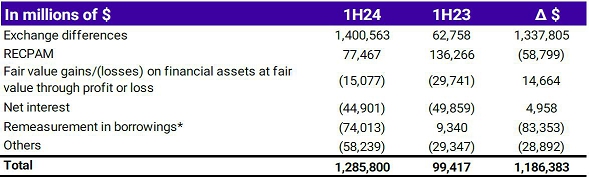 Exchange gains from exchange rate differences, measured in real terms, are the result of inflation outpacing the appreciation of the US dollar against the Argentine peso (79.8% vs. 12.8%, respectively in the 1H24).