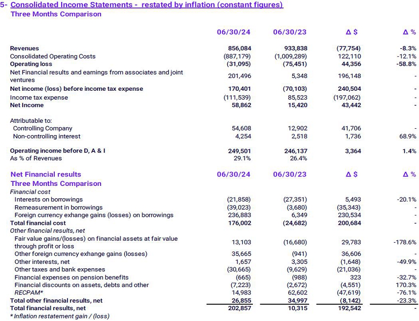 | · | Due to the real appreciation of the Argentine peso against the US dollar during 1H24 (due to inflation being higher than devaluation during the period), the Company recorded a net income of P$859,223 million (compared to an income of P$146,409 million in 1H23), mainly explained by gains from exchange rate differences in real terms included in Financial Results. |