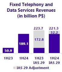 Revenues generated by fixed telephony and data services reached P$221,313 million in 1H24 (-P$2,404 million or -1.1% vs. 1H23). In 2Q24, fixed telephony and data services revenues were P$107,787 million (-2.9% vs. 2Q23)