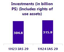 | · | Investments (including right-of-use assets) amounted to P$315,946 million in 1H24 (+3.7% in constant currency vs. 1H23), which represents 19.0% of our Consolidated Revenues. CAPEX (excluding right-of-use assets) during the 1H24 represented 13.5% of Consolidated Revenues. |