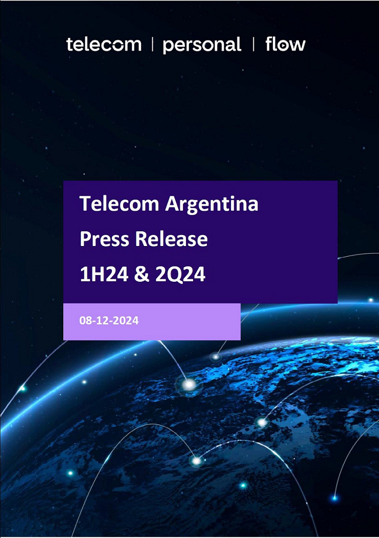 Buenos Aires, August 12, 2024 - Telecom Argentina S.A. (“Telecom Argentina”) - (NYSE: TEO; BYMA: TECO2), announced today a Net Income of P$859,223 million for the period ended June 30, 2024, mainly explained by gains from exchange rate differences in real terms included in Financial Results. The Net Income attributable to the controlling company was P$851,682 million.