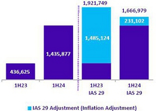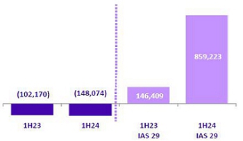Exchange gains from exchange rate differences, measured in real terms, are the result of inflation outpacing the appreciation of the US dollar against the Argentine peso (79.8% vs. 12.8%, respectively in the 1H24).