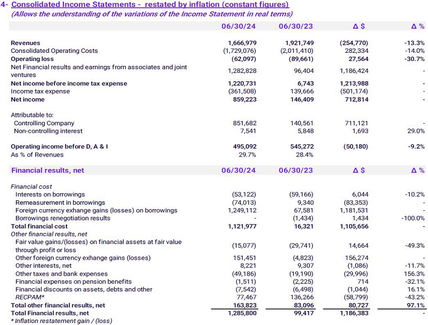 It should be noted that comparative figures for the previous fiscal year have been restated by inflation so that the resulting information is presented in terms of the current measurement unit as of June 30, 2024.