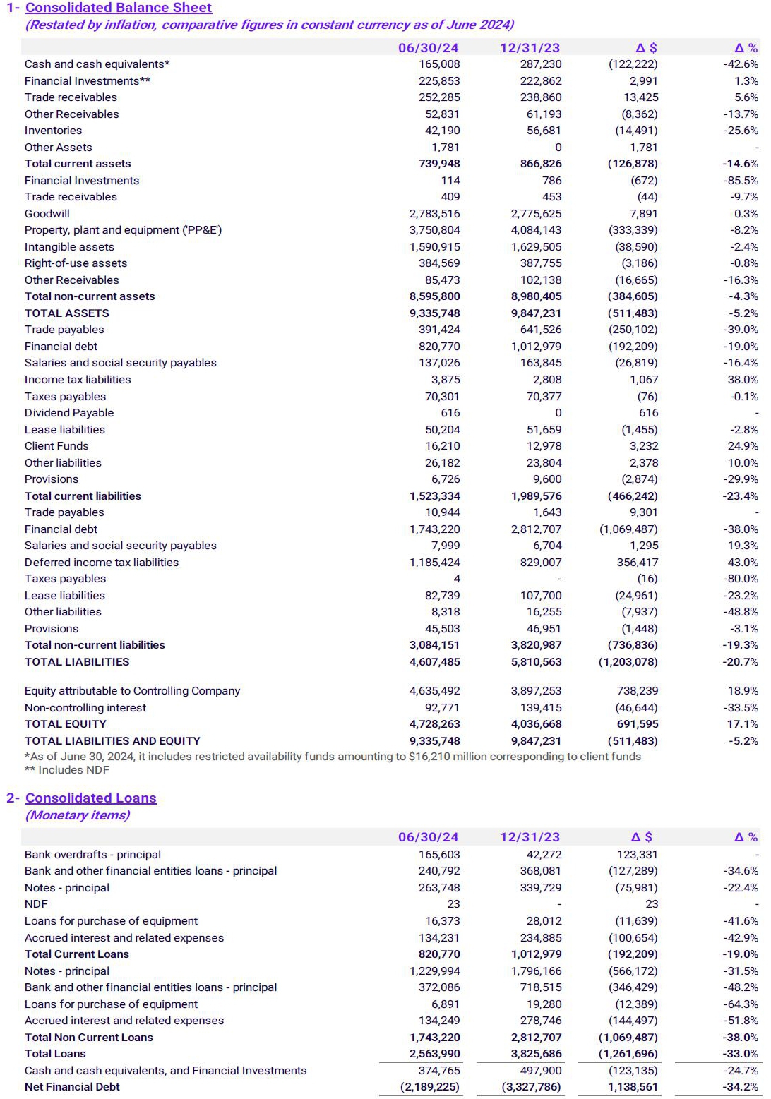 As of June 30, 2024, our net financial debt (cash, cash equivalents – net of Client Funds - plus financial investments and financial NDF* minus loans) is passive and amounted to P$2,189,225 million, which represents a decrease of P$1,135,776 when compared to the net financial debt as of December 31, 2023, restated by inflation.