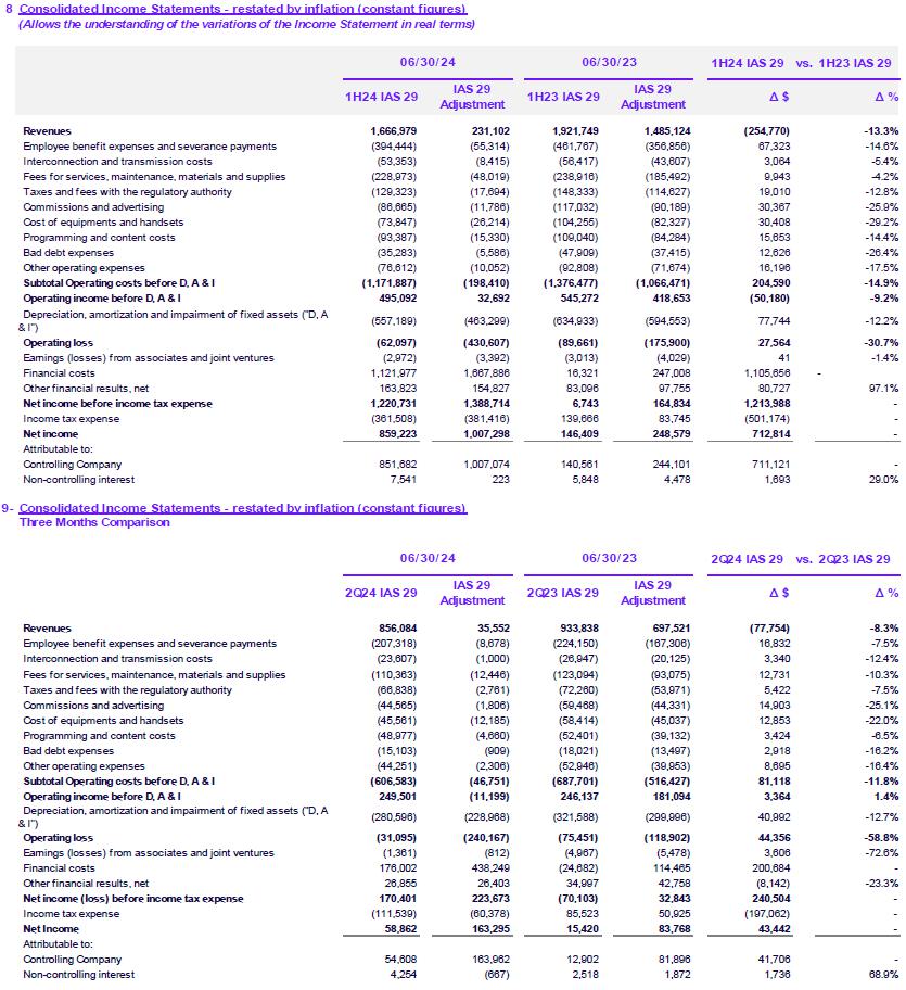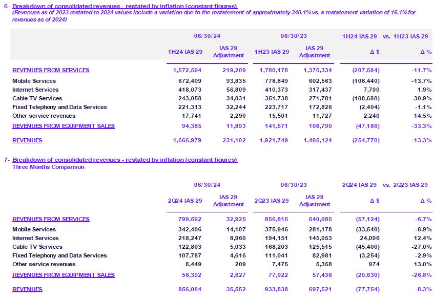 | · | The Company's Consolidated Revenues amounted to P$1,666,979 million in 1H24 (-13.3% in constant currency compared to 1H23). Service Revenues totaled P$1,572,594 million (-11.7% vs. 1H23), in a context where year-over-year inflation remains at high levels. In 2Q24, revenues reached P$856,084 million (-8.3% vs. 2Q23) while Service Revenues totaled P$799,692 million (-6.7% vs. 2Q23 and +3.5% vs. 1Q24), indicating an improvement in the trend of these revenues in real terms. |