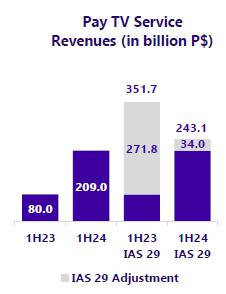 Cable TV service revenues reached P$243,058 million in 1H24 (-P$108,680 million or -30.9% vs. 1H23). In 2Q24, cable TV service revenues were P$122,803 million (-27.0% vs. 2Q23). Cable TV subscribers, including Uruguay and Paraguay, exceeded 3.3 million (-23 thousand vs. 1H23). The monthly Cable TV ARPU (restated in constant currency as of June 30, 2024) reached P$11,098.1 during 1H24 (vs. P$16,607.4 in 1H23). The effect generated by the restatement in terms of the measuring unit as of June 30, 2024, included in the ARPU amounts to P$1,540.4 and P$12,835.5, for 1H24 and 1H23, respectively.