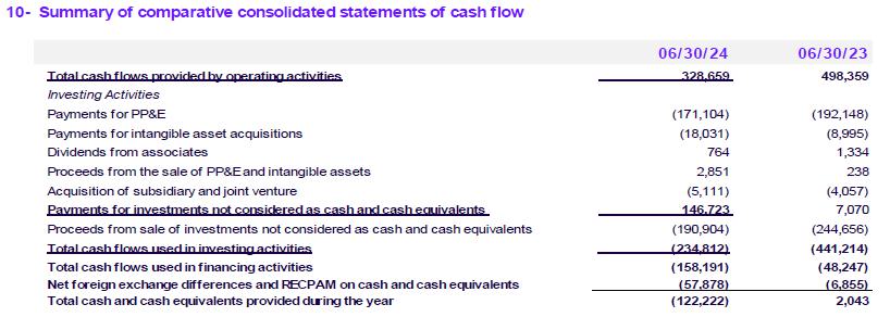 | · | Investments (including right-of-use assets) amounted to P$315,946 million in 1H24 (+3.7% in constant currency vs. 1H23), which represents 19.0% of our Consolidated Revenues. CAPEX (excluding right-of-use assets) during the 1H24 represented 13.5% of Consolidated Revenues. |