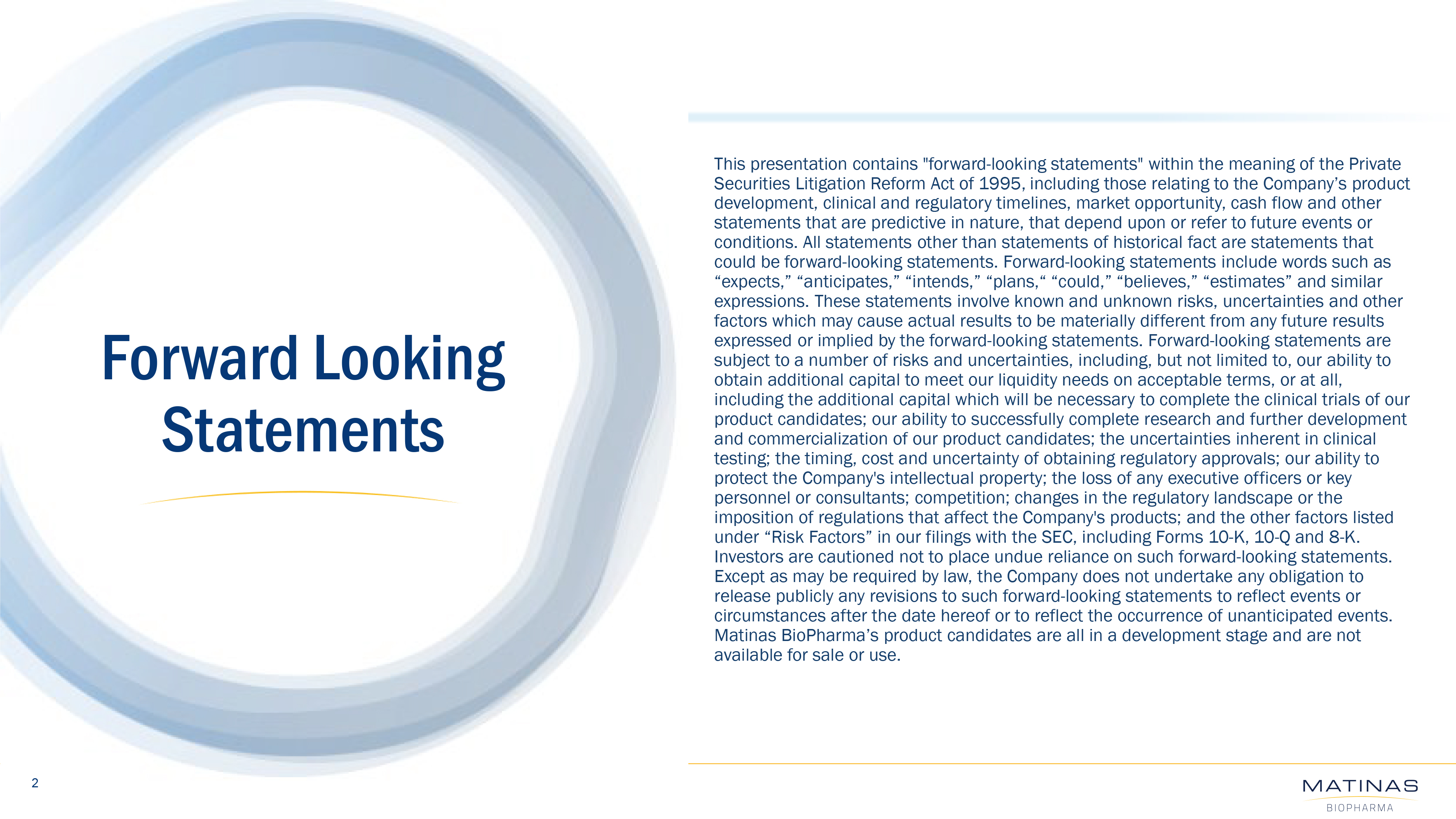 This release contains “forward-looking statements” within the meaning of the Private Securities Litigation Reform Act of 1995, including those relating to our business activities, our strategy and plans, the potential of our LNC platform technology, and the future development of our product candidates, including MAT2203, the Company’s ability to identify and pursue development, licensing and partnership opportunities for its products, including MAT2203, or platform delivery technologies on favorable terms, if at all, and the ability to obtain required regulatory approval and other statements that are predictive in nature, that depend upon or refer to future events or conditions. All statements other than statements of historical fact are statements that could be forward-looking statements. Forward-looking statements include words such as “expects,” “anticipates,” “intends,” “plans,” “could,” “believes,” “estimates” and similar expressions. These statements involve known and unknown risks, uncertainties and other factors which may cause actual results to be materially different from any future results expressed or implied by the forward-looking statements. Forward-looking statements are subject to a number of risks and uncertainties, including, but not limited to, our ability to continue as a going concern, our ability to obtain additional capital to meet our liquidity needs on acceptable terms, or at all, including the additional capital which will be necessary to complete the clinical trials of our product candidates; our ability to successfully complete research and further development and commercialization of our product candidates; the uncertainties inherent in clinical testing; the timing, cost and uncertainty of obtaining regulatory approvals; our ability to protect the Company’s intellectual property; the loss of any executive officers or key personnel or consultants; competition; changes in the regulatory landscape or the imposition of regulations that affect the Company’s products; and the other factors listed under “Risk Factors” in our filings with the SEC, including Forms 10-K, 10-Q and 8-K. Investors are cautioned not to place undue reliance on such forward-looking statements, which speak only as of the date of this release. Except as may be required by law, the Company does not undertake any obligation to release publicly any revisions to such forward-looking statements to reflect events or circumstances after the date hereof or to reflect the occurrence of unanticipated events. Matinas BioPharma’s product candidates are all in a development stage and are not available for sale or use.