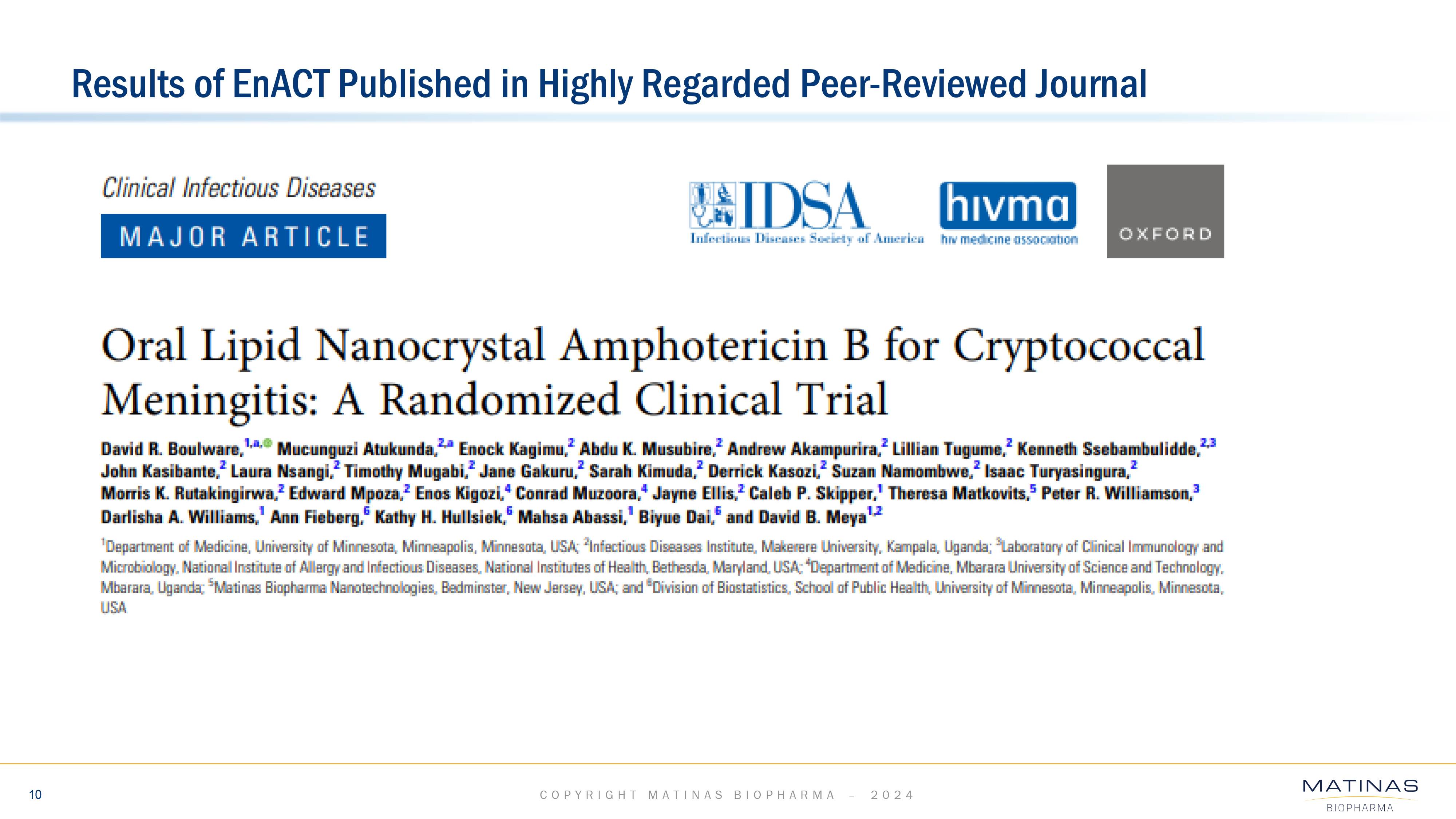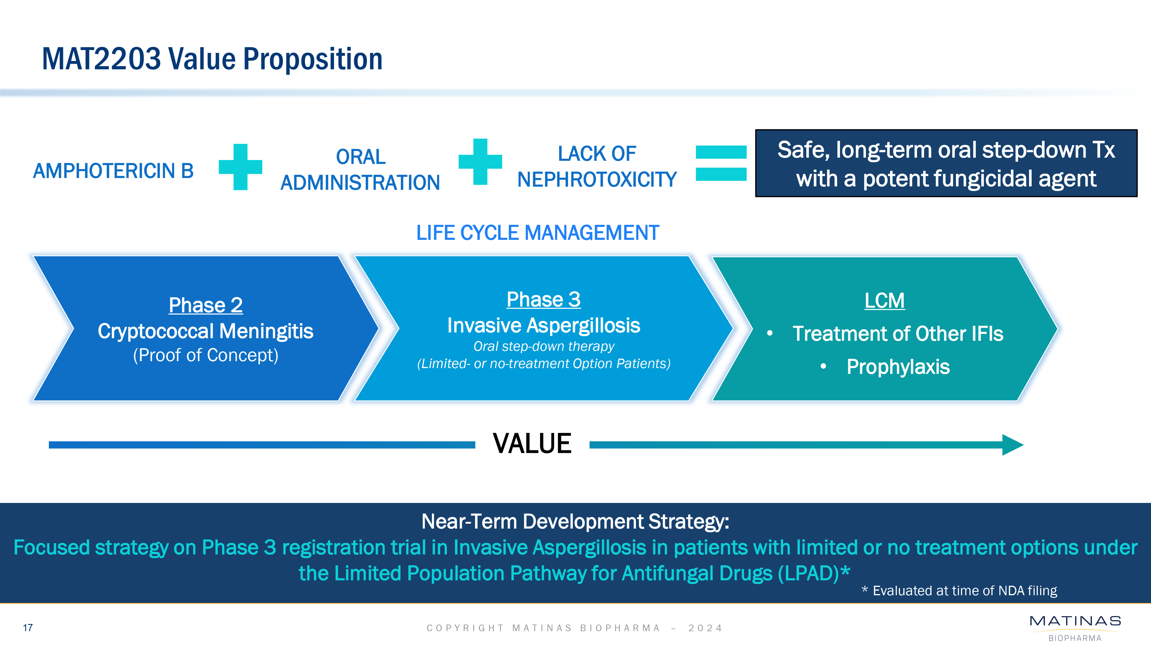 Matinas’ lead LNC-based therapy is MAT2203, an oral formulation of the broad-spectrum antifungal drug amphotericin B, which although highly potent, can be associated with significant toxicity. Matinas’ LNC platform provides oral delivery of amphotericin B without the significant nephrotoxicity otherwise associated with IV-delivered formulations. Combining comparable fungicidal activity with targeted delivery results in a lower risk of toxicity and potentially creates the ideal antifungal agent for the treatment of invasive fungal infections. MAT2203 was successfully evaluated in the completed Phase 2 EnACT study in HIV patients suffering from cryptococcal meningitis, meeting its primary endpoint and achieving robust survival. MAT2203 will be further evaluated in a single Phase 3 registration trial (the “ORALTO” trial) as an oral step-down monotherapy following treatment with AmBisome® (liposomal amphotericin B) compared with the standard of care in patients with invasive aspergillosis who have limited treatment options.