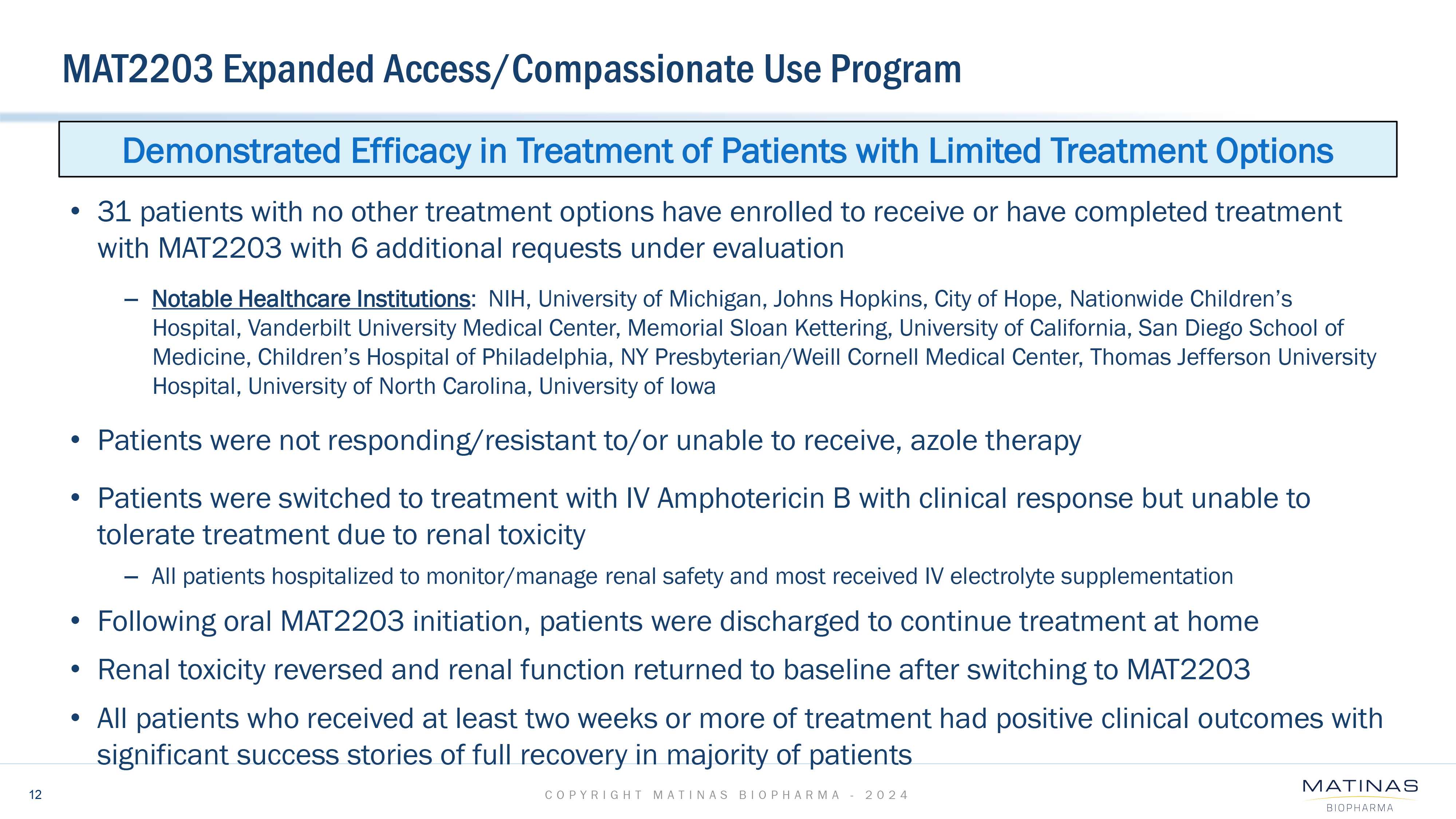 31 patients have enrolled in the MAT2203 Compassionate/Expanded Use Access Program with 6 additional patients under evaluation