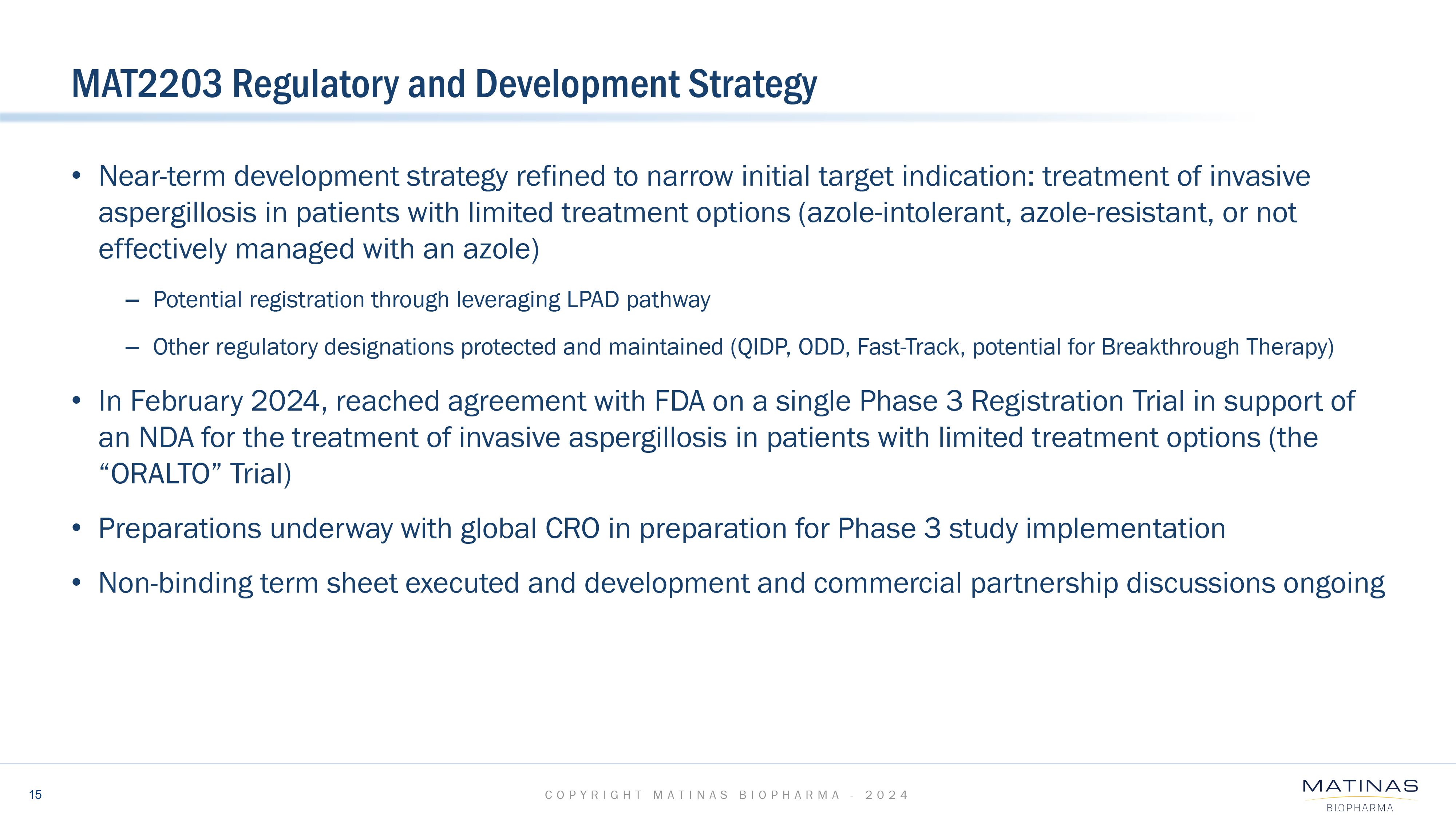 Signs non-binding term sheet granting global rights to develop and commercialize oral MAT2203 for invasive aspergillosis and potentially other invasive fungal infections