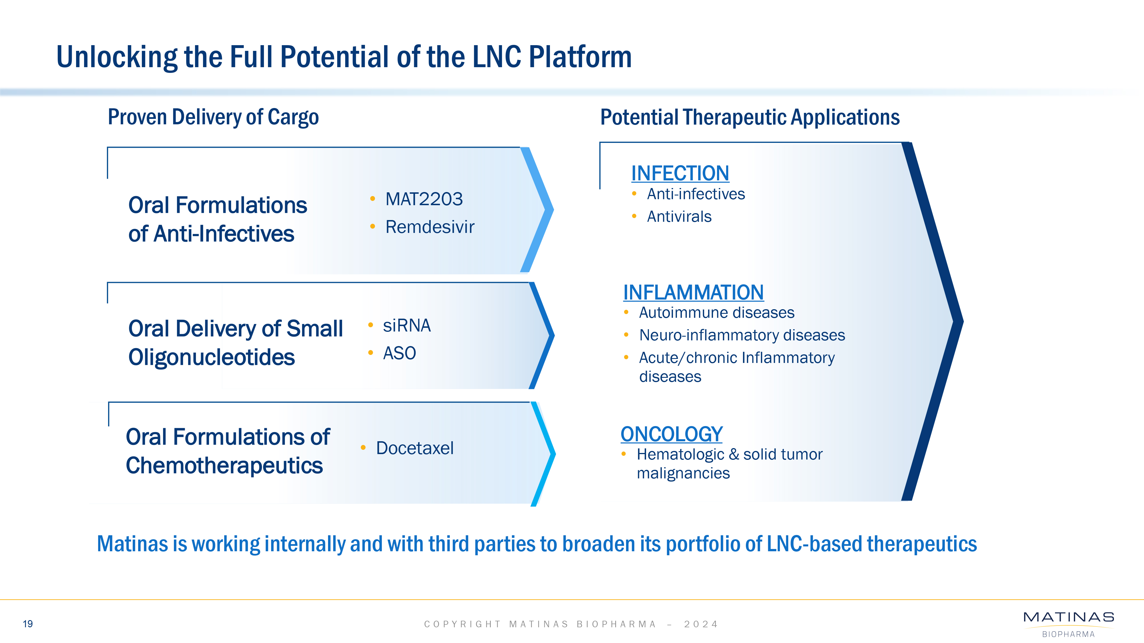 In addition to MAT2203, preclinical and clinical data have demonstrated that this novel technology can potentially provide solutions to many challenges of achieving safe and effective intracellular delivery of both small molecules and larger, more complex molecular cargos including small oligonucleotides such as ASOs and siRNA. The combination of its unique mechanism of action and flexibility with routes of administration (including oral) positions Matinas’ LNC technology to potentially become a preferred next-generation orally available intracellular drug delivery platform. For more information, please visit www.matinasbiopharma.com.