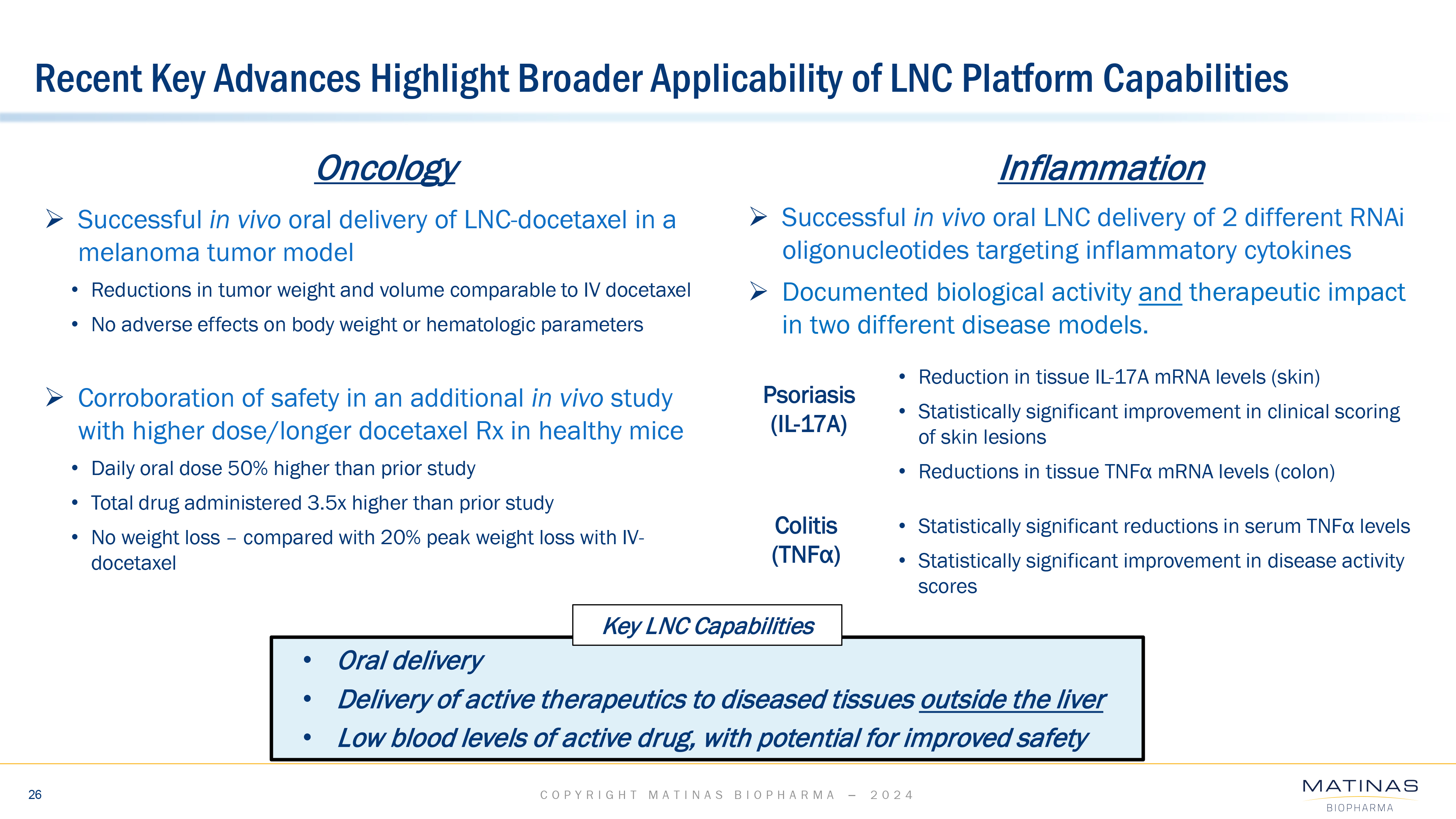 Additional LNC platform work in inflammation and oncology completed; Company evaluating next steps