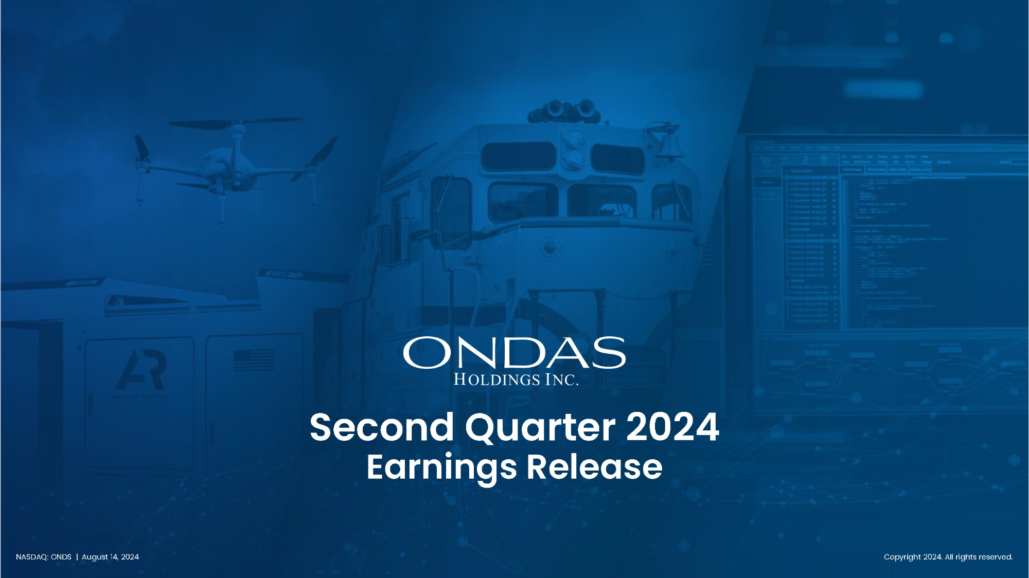 MARLBOROUGH, MA – August 14, 2024 - Ondas Holdings Inc. (Nasdaq: ONDS) (“Ondas” or the “Company”), a leading provider of private industrial wireless networks and commercial drone and automated data solutions through our Ondas Networks and Ondas Autonomous Systems (OAS) business units, reported financial and operating results for the second quarter ended June 30, 2024.