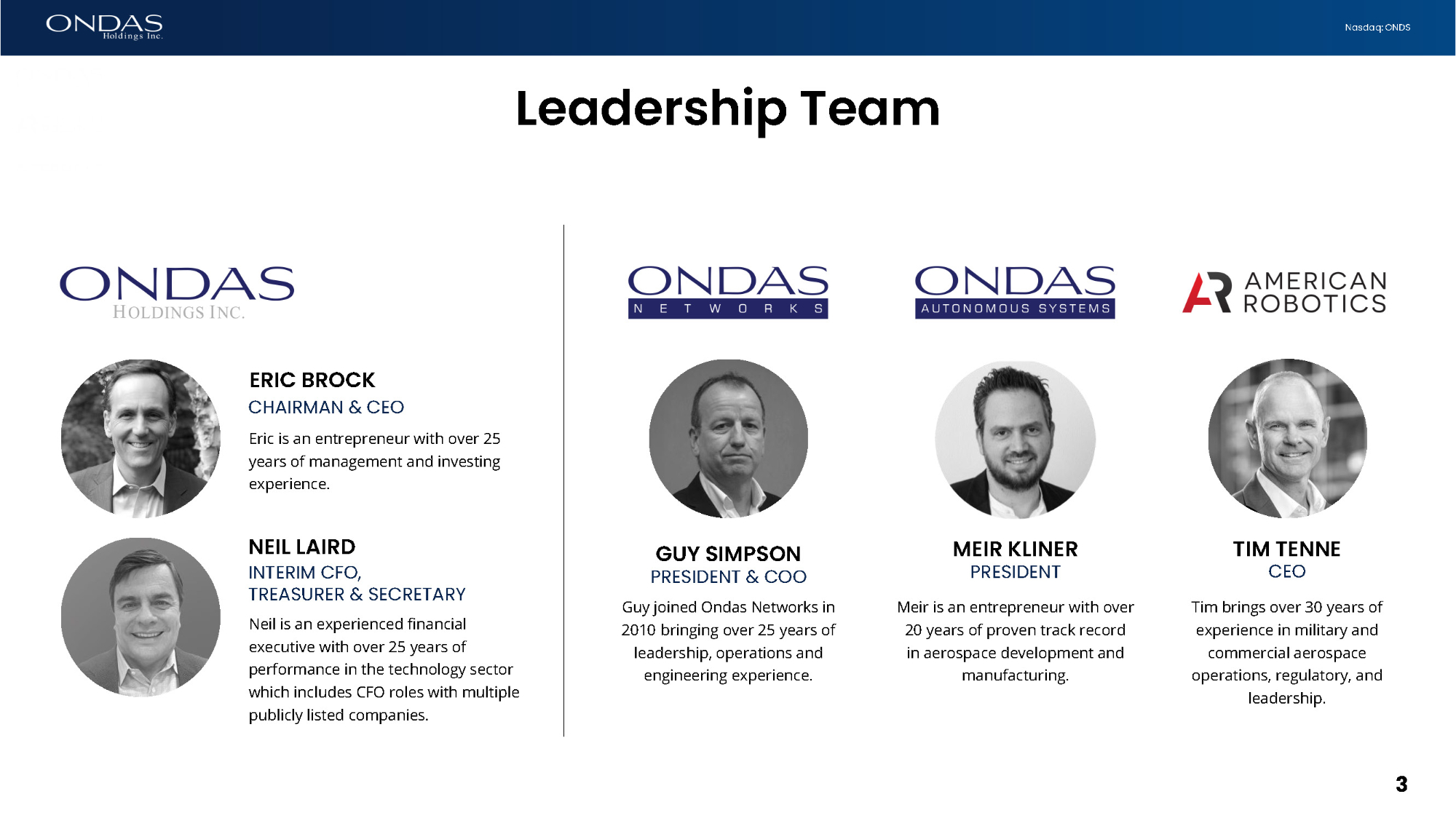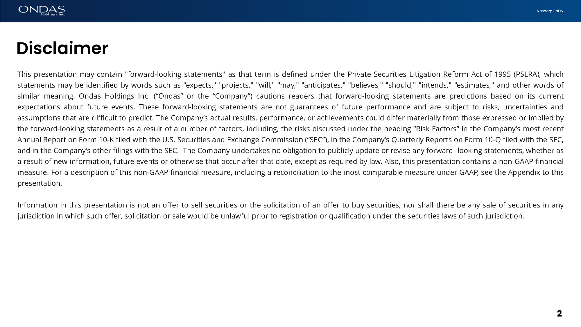Nasdaq: ONDS This presentation may contain "forward - looking statements" as that term is defined under the Private Securities Litigation Reform Act of 1995 (PSLRA), which statements may be identified by words such as "expects," "projects," "will," "may," "anticipates," "believes," "should," "intends," "estimates," and other words of similar meaning . Ondas Holdings Inc . (“Ondas” or the “Company”) cautions readers that forward - looking statements are predictions based on its current expectations about future events . These forward - looking statements are not guarantees of future performance and are subject to risks, uncertainties and assumptions that are difficult to predict . The Company’s actual results, performance, or achievements could differ materially from those expressed or implied by the forward - looking statements as a result of a number of factors, including, the risks discussed under the heading “Risk Factors” in the Company’s most recent Annual Report on Form 10 - K filed with the U . S . Securities and Exchange Commission (“SEC”), in the Company’s Quarterly Reports on Form 10 - Q filed with the SEC, and in the Company’s other filings with the SEC . The Company undertakes no obligation to publicly update or revise any forward - looking statements, whether as a result of new information, future events or otherwise that occur after that date, except as required by law . Also, this presentation contains a non - GAAP financial measure . For a description of this non - GAAP financial measure, including a reconciliation to the most comparable measure under GAAP, see the Appendix to this presentation . Information in this presentation is not an offer to sell securities or the solicitation of an offer to buy securities, nor shall there be any sale of securities in any jurisdiction in which such offer, solicitation or sale would be unlawful prior to registration or qualification under the securities laws of such jurisdiction . 2 Discl6imer
