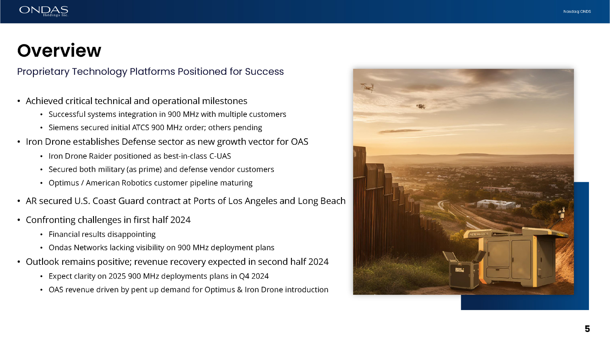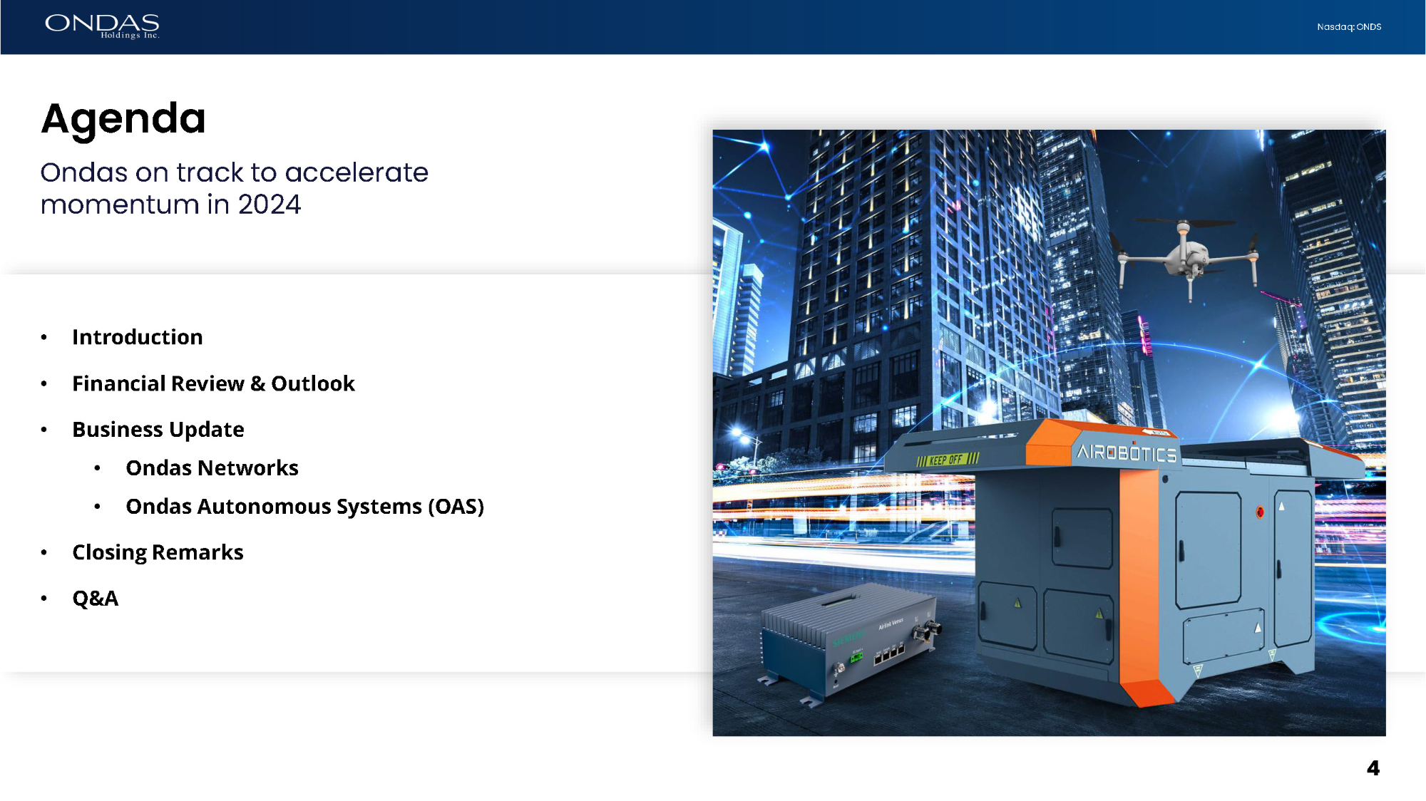 Nasdaq: ONDS Agefid6 4 Ondas on track to accelerate momentum in 2024 • Introduction • Financial Review & Outlook • Business Update • Ondas Networks • Ondas Autonomous Systems (OAS) • Closing Remarks • Q&A