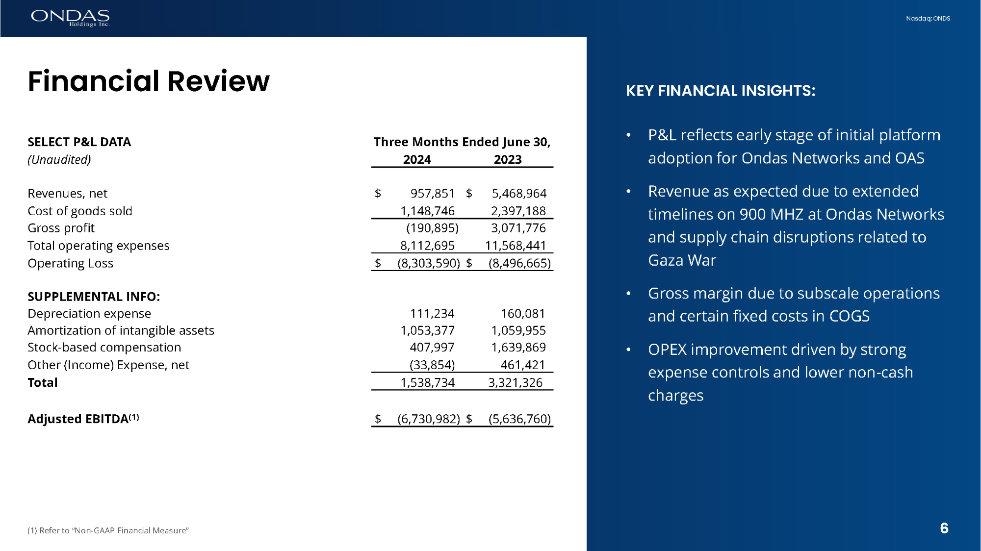 Nasdaq: ONDS Overview 5 Proprietary Technology Platforms Positioned for Success • Achieved critical technical and operational milestones • Successful systems integration in 900 MHz with multiple customers • Siemens secured initial ATCS 900 MHz order; others pending • Iron Drone establishes Defense sector as new growth vector for OAS • Iron Drone Raider positioned as best - in - class C - UAS • Secured both military (as prime) and defense vendor customers • Optimus / American Robotics customer pipeline maturing • AR secured U.S. Coast Guard contract at Ports of Los Angeles and Long Beach • Confronting challenges in first half 2024 • Financial results disappointing • Ondas Networks lacking visibility on 900 MHz deployment plans • Outlook remains positive; revenue recovery expected in second half 2024 • Expect clarity on 2025 900 MHz deployments plans in Q4 2024 • OAS revenue driven by pent up demand for Optimus & Iron Drone introduction