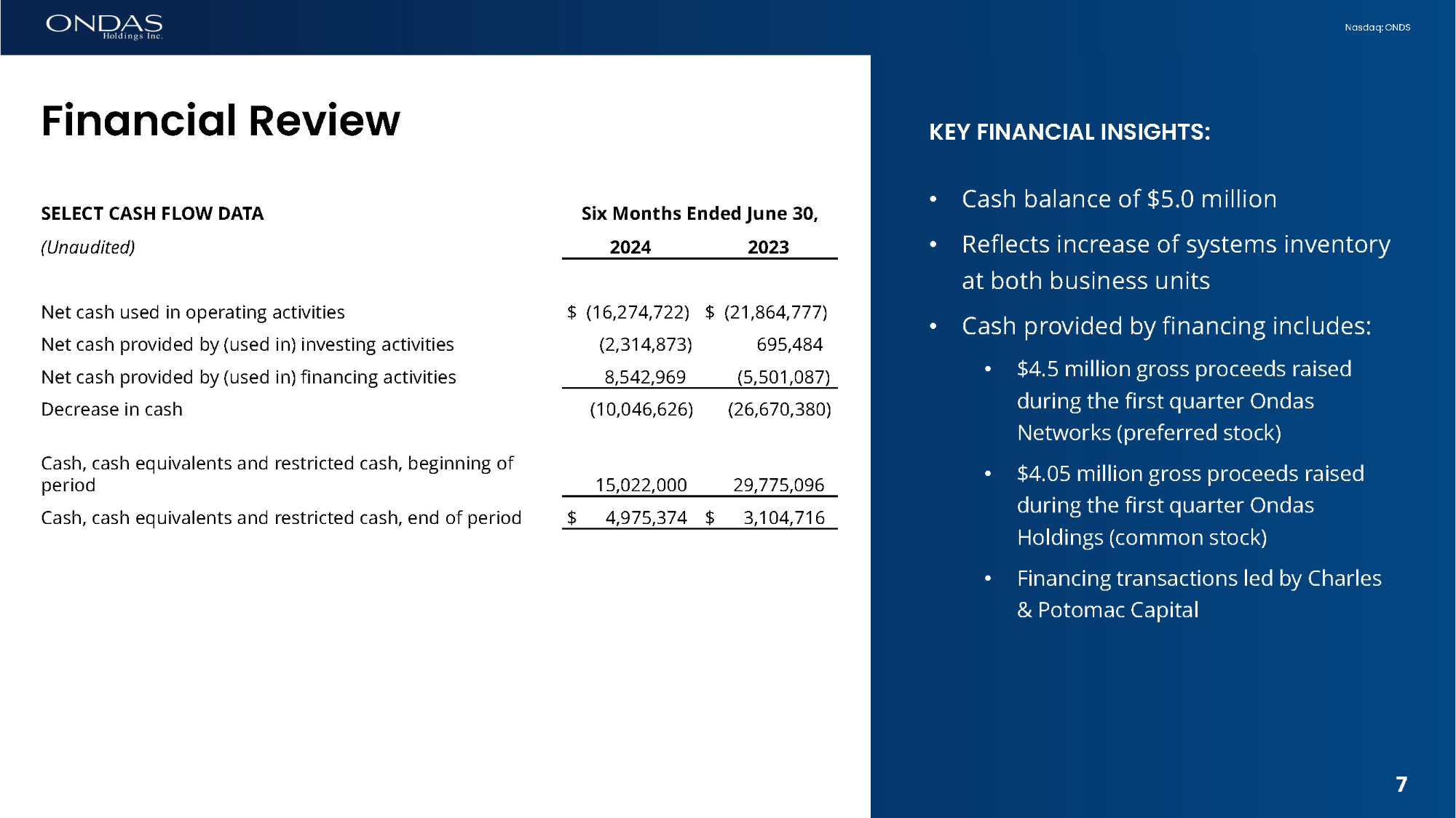 6 Nasdaq: ONDS KEY FINANCIAL INSIGHTS: • P&L reflects early stage of initial platform adoption for Ondas Networks and OAS • Revenue as expected due to extended timelines on 900 MHZ at Ondas Networks and supply chain disruptions related to Gaza War • Gross margin due to subscale operations and certain fixed costs in COGS • OPEX improvement driven by strong expense controls and lower non - cash charges (1) Refer to “Non - GAAP Financial Measure” Fifi6fici6l Review 6 Three Months Ended June 30, SELECT P&L DATA 2023 2024 (Unaudited) $ 5,468,964 $ 957,851 Revenues, net 2,397,188 1,148,746 Cost of goods sold 3,071,776 (190,895) Gross profit 11,568,441 8,112,695 Total operating expenses $ (8,496,665) $ (8,303,590) Operating Loss SUPPLEMENTAL INFO: 160,081 111,234 Depreciation expense 1,059,955 1,053,377 Amortization of intangible assets 1,639,869 407,997 Stock - based compensation 461,421 (33,854) Other (Income) Expense, net 3,321,326 1,538,734 Total $ (5,636,760) $ (6,730,982) Adjusted EBITDA (1)