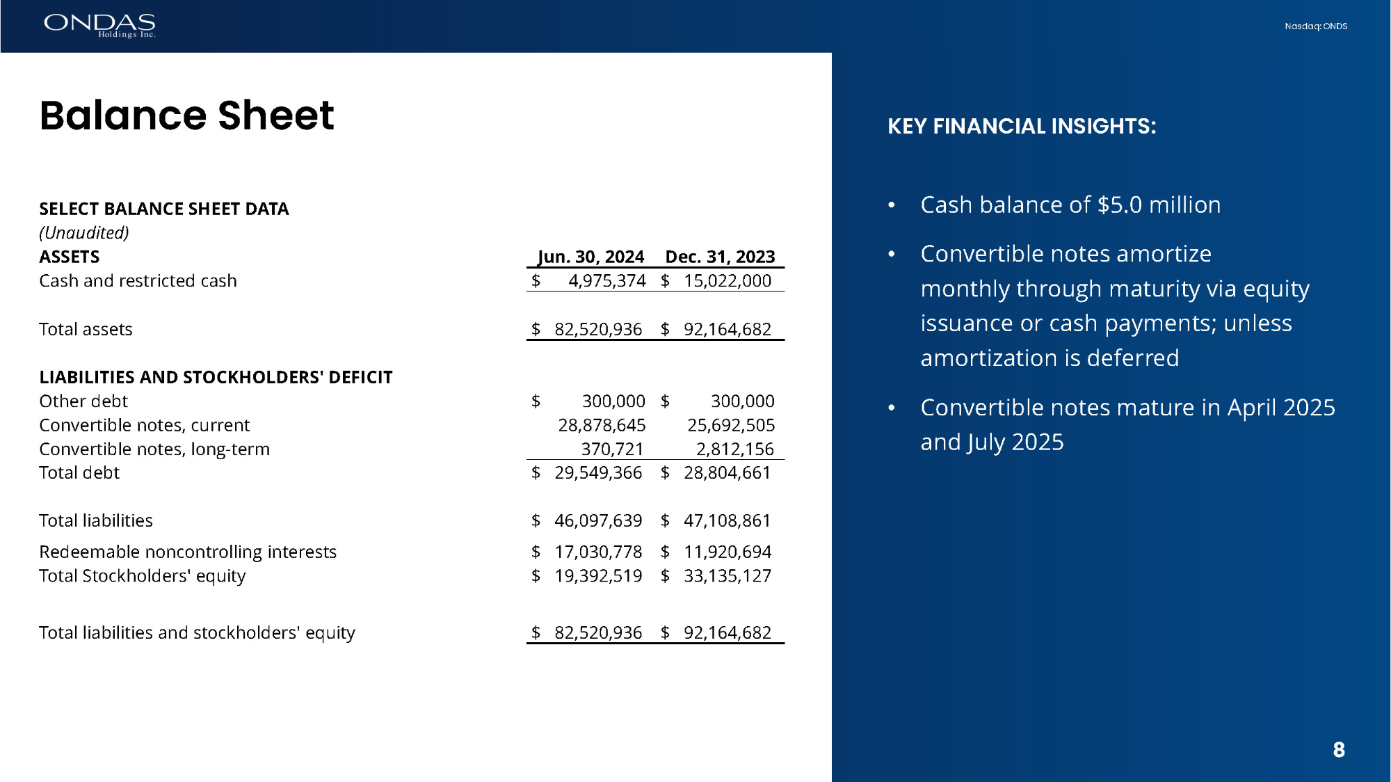 Nasdaq: ONDS KEY FINANCIAL INSIGHTS: 7 7 • Cash balance of $5.0 million • Reflects increase of systems inventory at both business units • Cash provided by financing includes: • $4.5 million gross proceeds raised during the first quarter Ondas Networks (preferred stock) • $4.05 million gross proceeds raised during the first quarter Ondas Holdings (common stock) • Financing transactions led by Charles & Potomac Capital Fifi6fici6l Review Six Months Ended June 30, SELECT CASH FLOW DATA 2023 2024 (Unaudited) $ (21,864,777) $ (16,274,722) Net cash used in operating activities 695,484 (2,314,873) Net cash provided by (used in) investing activities (5,501,087) 8,542,969 Net cash provided by (used in) financing activities (26,670,380) (10,046,626) Decrease in cash 29,775,096 15,022,000 Cash, cash equivalents and restricted cash, beginning of period $ 3,104,716 $ 4,975,374 Cash, cash equivalents and restricted cash, end of period